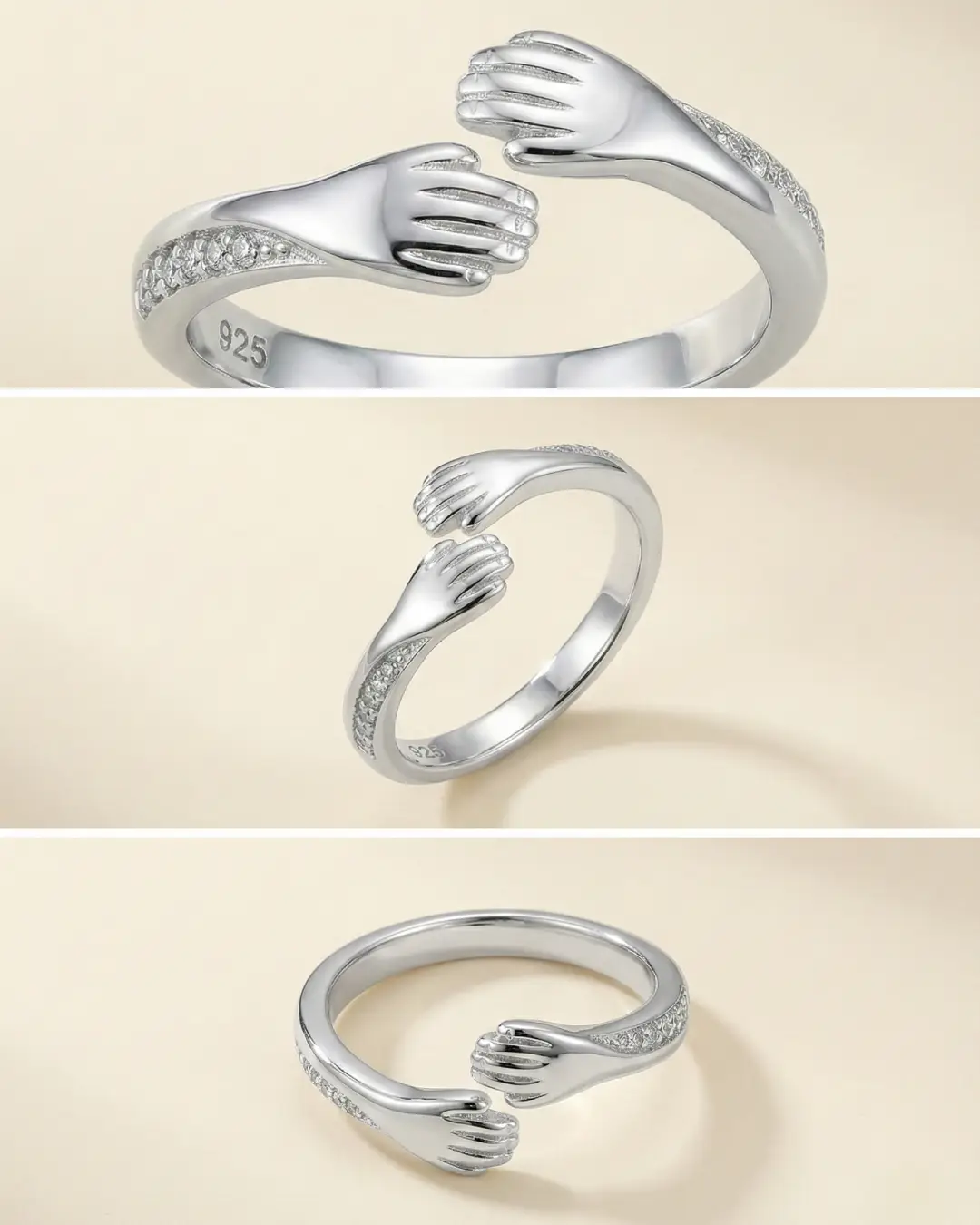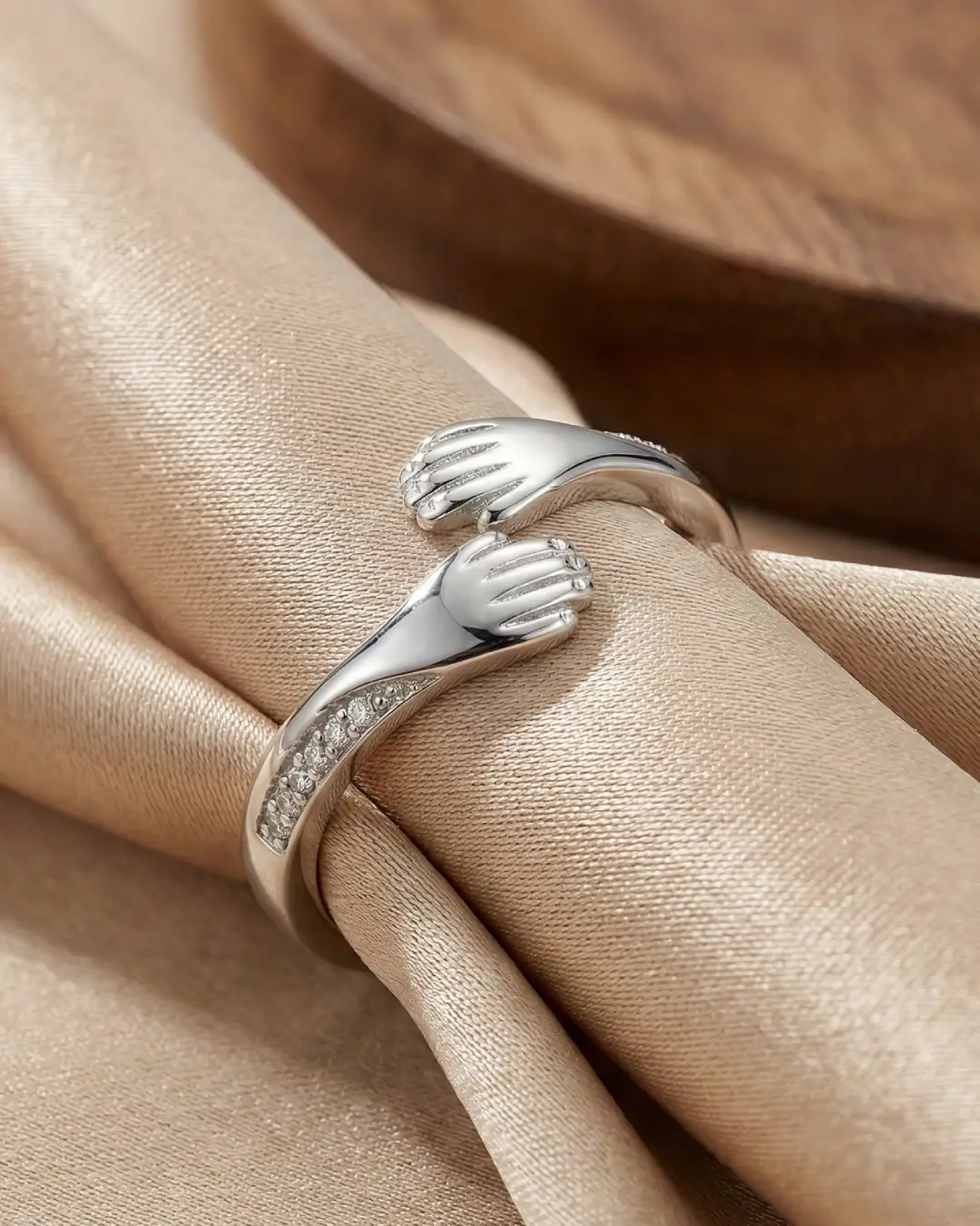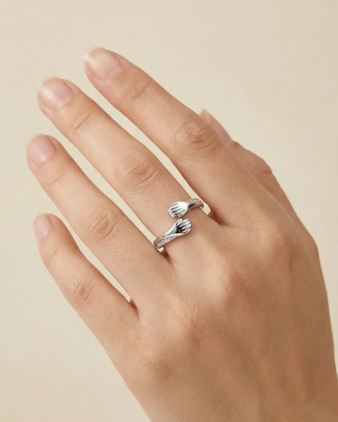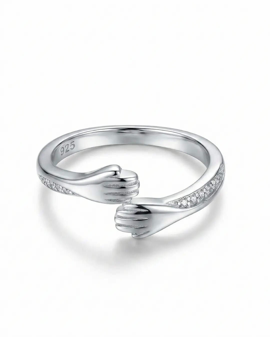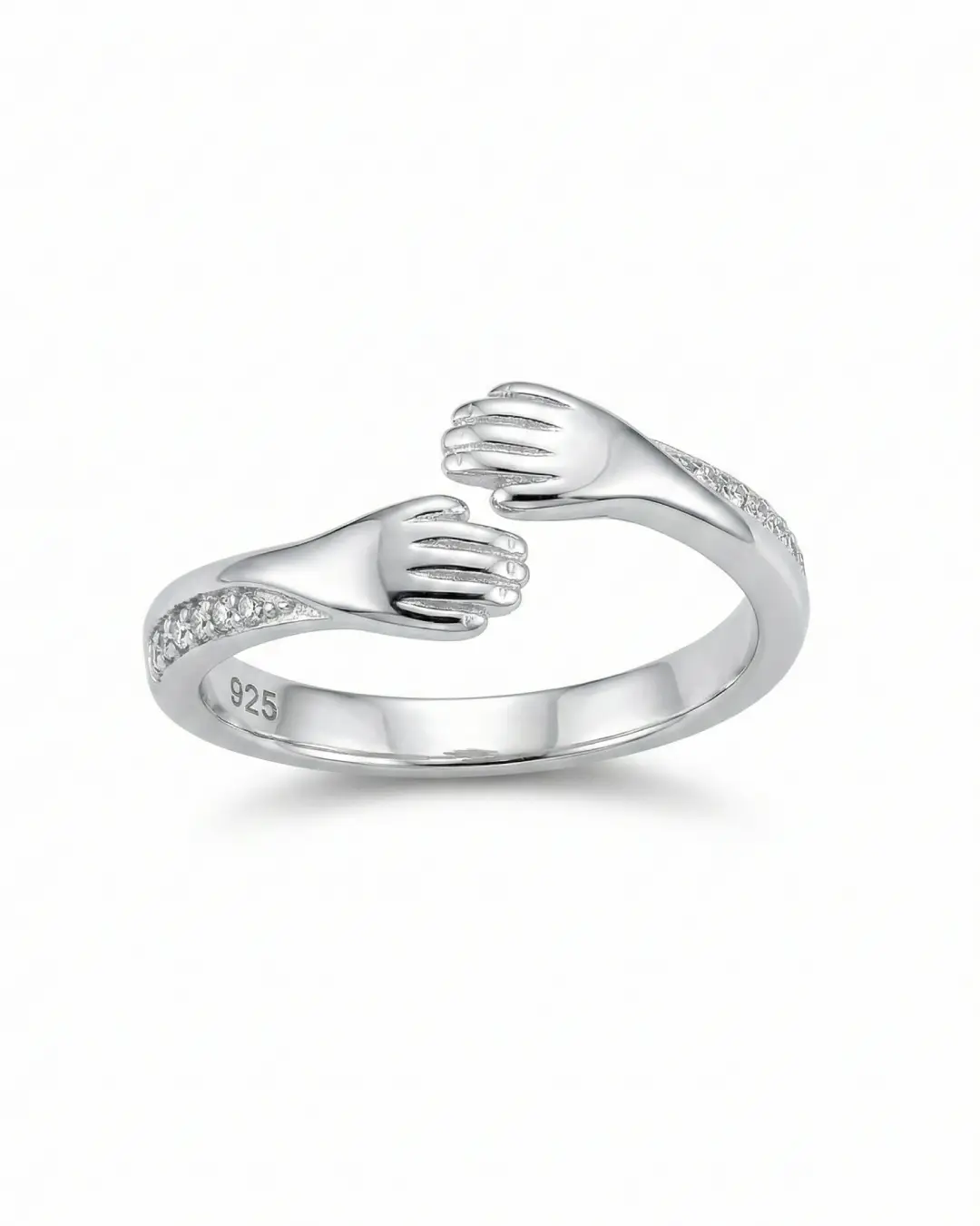 Capture the feeling of a comforting embrace with this beautifully crafted open-band ring. Designed to symbolize love, connection, and support, the ring features two sculpted hands that gently wrap around your finger. The band is delicately accented with sparkling pavé-set stones on the cuffs, adding a touch of luxe elegance to this sentimental piece.