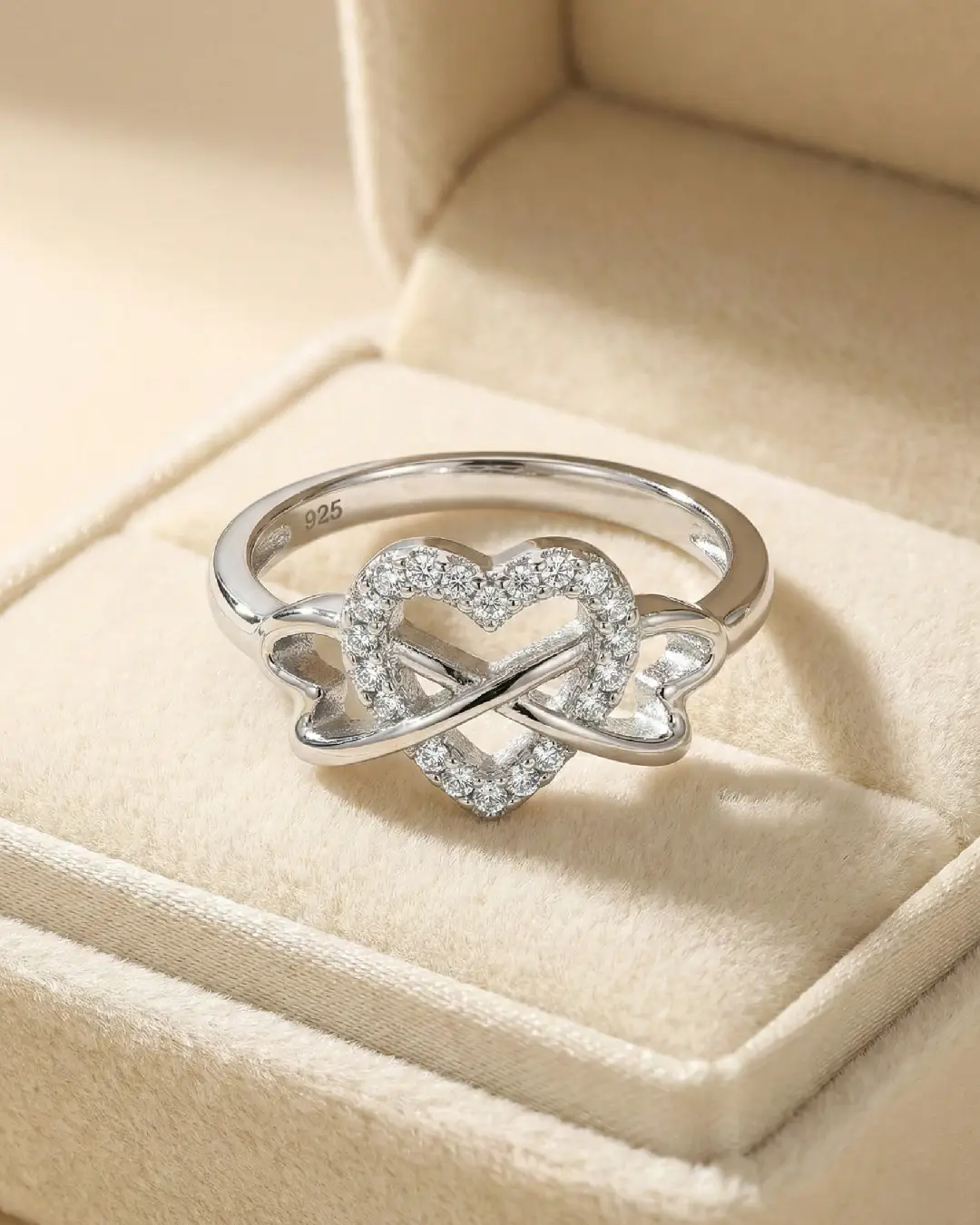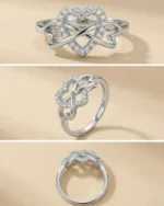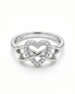 The centerpiece features a heart silhouette encrusted with brilliant, pavé-set stones that shimmer with every movement. Woven through the heart is a polished silver loop, creating a “knot” effect that represents inseparable connection. Whether it’s a promise to a partner, a gift to a best friend, or a treat for yourself, this ring is a sophisticated statement of enduring affection.
