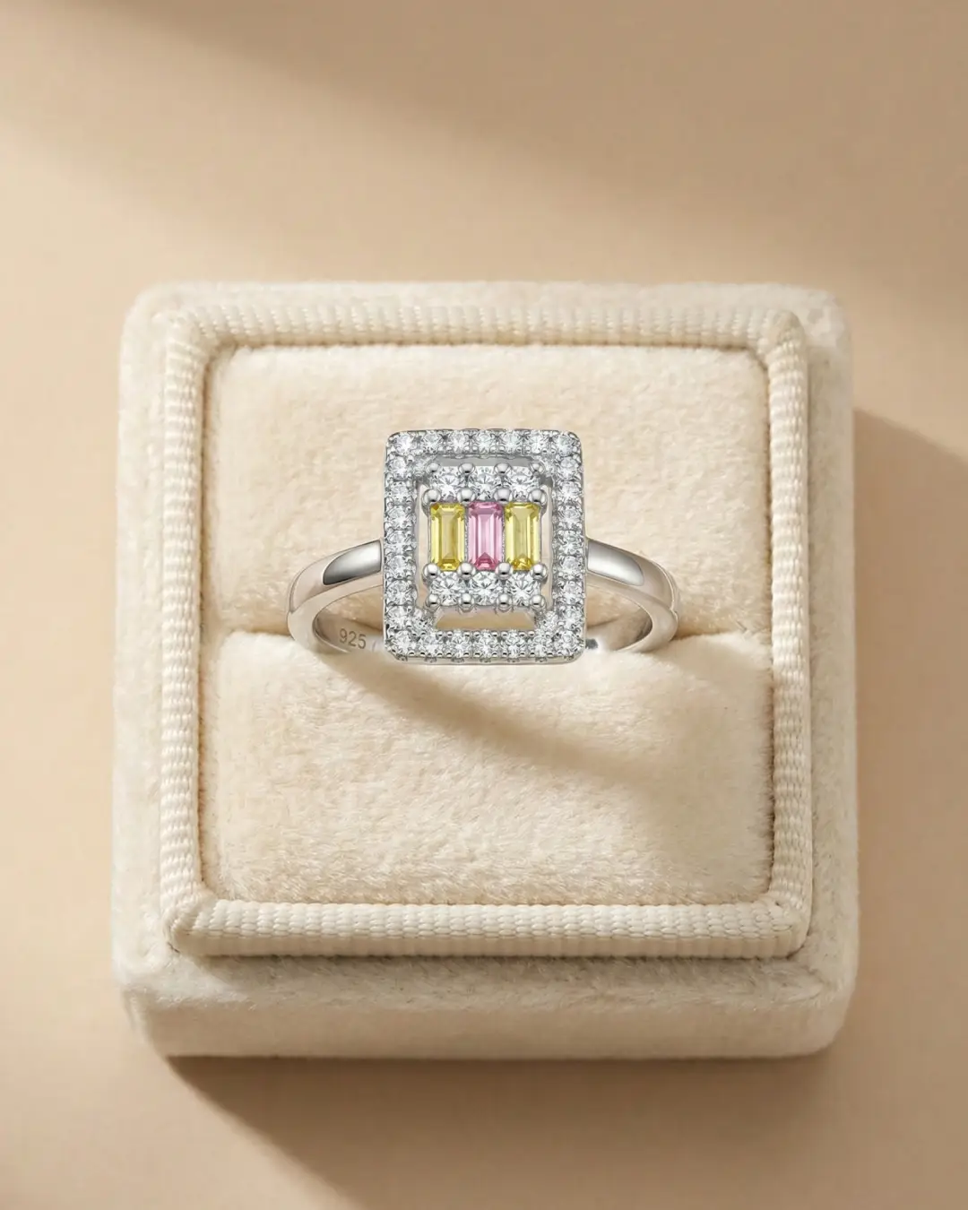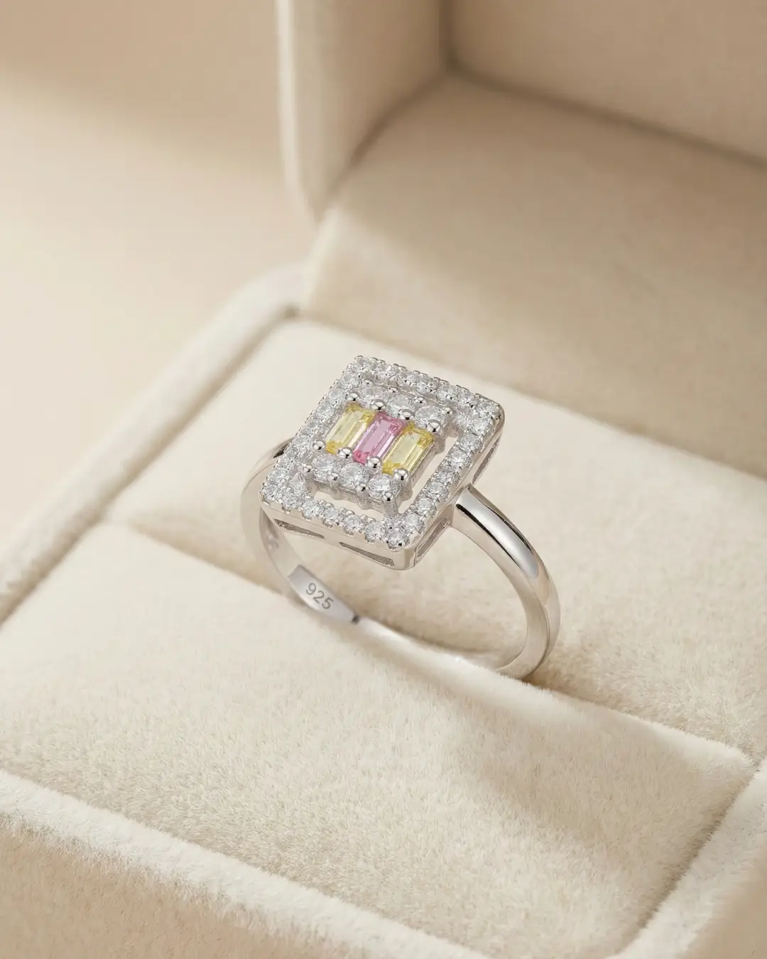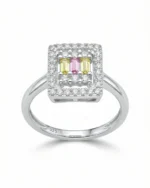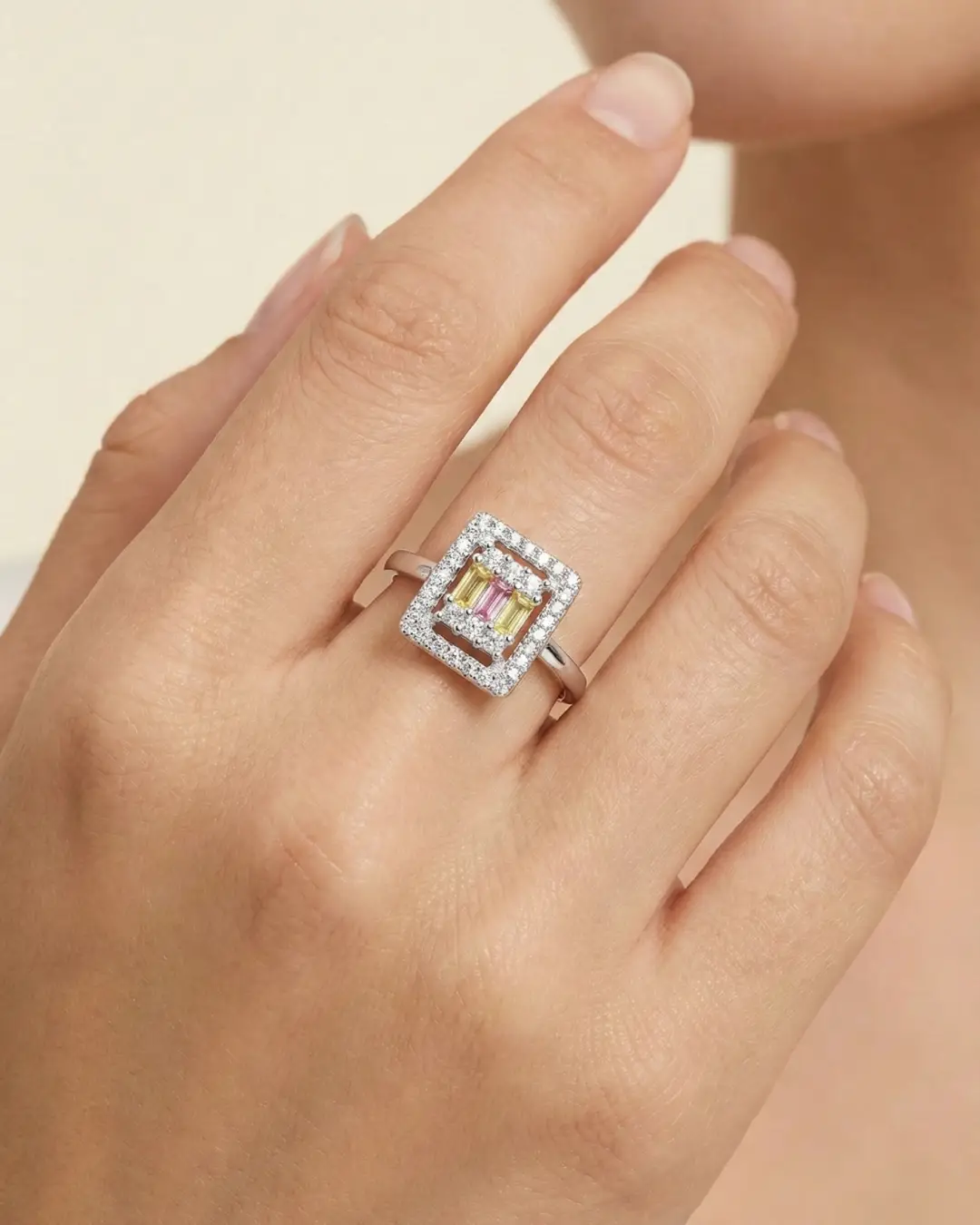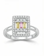 Add a playful yet sophisticated pop of colour to your collection with the Tricolor Baguette Halo Ring. This unique piece features a captivating geometric design, showcasing three baguette-cut stones in soft yellow and pink hues, nestled within a cluster of sparkling round crystals.