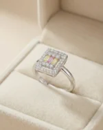 Framed by a brilliant rectangular halo of white stones, the centrepiece creates a stunning mosaic effect that catches the light from every angle. Set on a sleek, polished 925 Sterling Silver band, this ring is the perfect conversation starter—blending modern art deco vibes with a touch of whimsical charm.