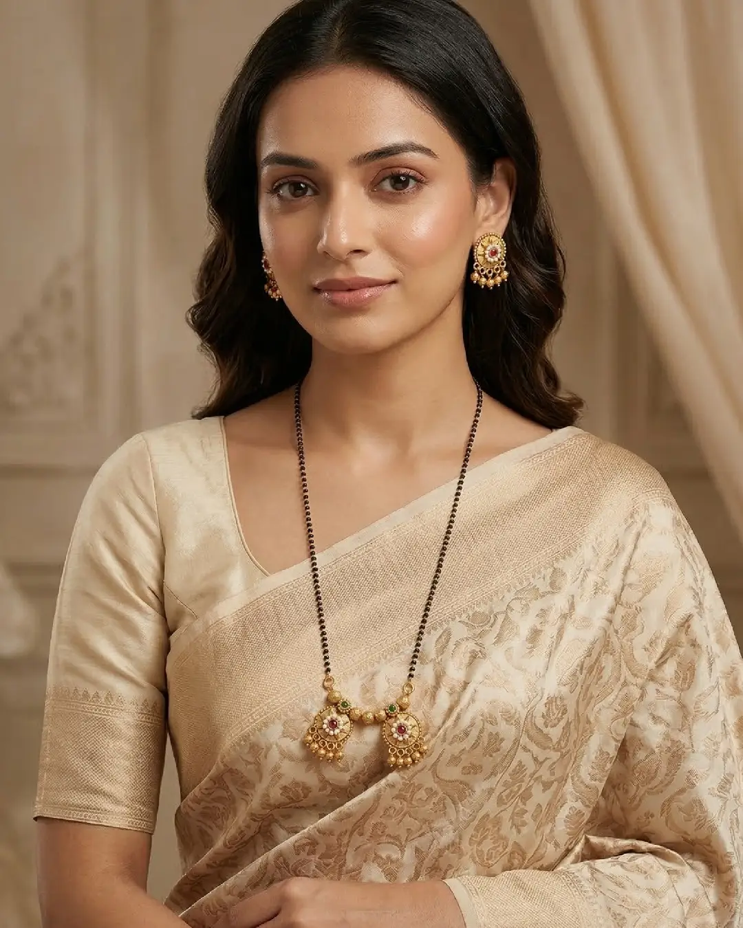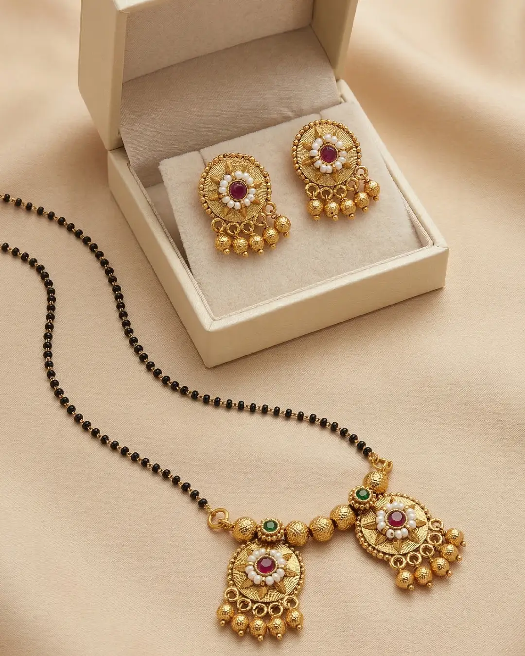- Chain: The classic black bead chain (mangalsutra beads) is accented with gold-toned spacers and emerald-green highlights for a pop of color.