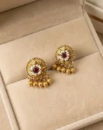 - Design: Each circular pendant is adorned with a central ruby-red stone, surrounded by delicate white pearls and finished with traditional gold droplets.