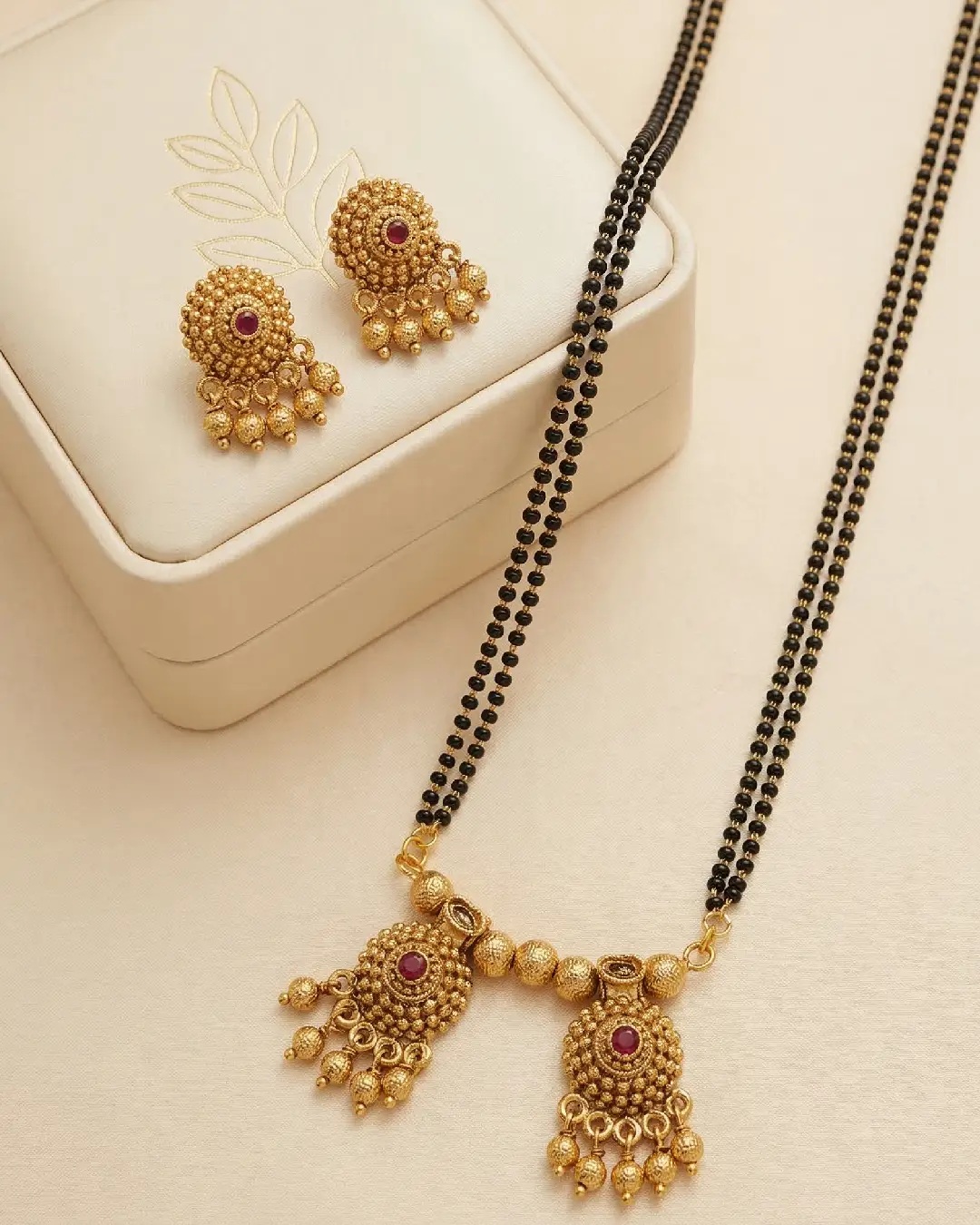 Be the first to review “Antique Gold-Plated Twin Pendant Mangalsutra Set with Ruby Accents” Cancel reply