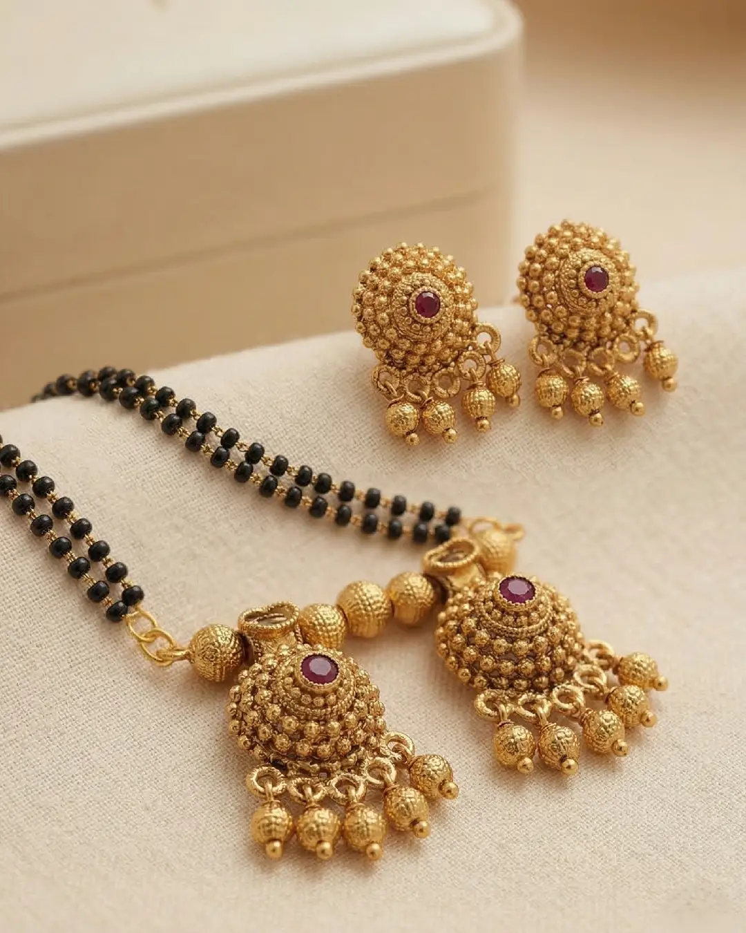 • Intricate Artistry: The pendant and earrings showcase detailed granulation work (Rava technique) and delicate gold bead droplets that provide a rich, textured look.