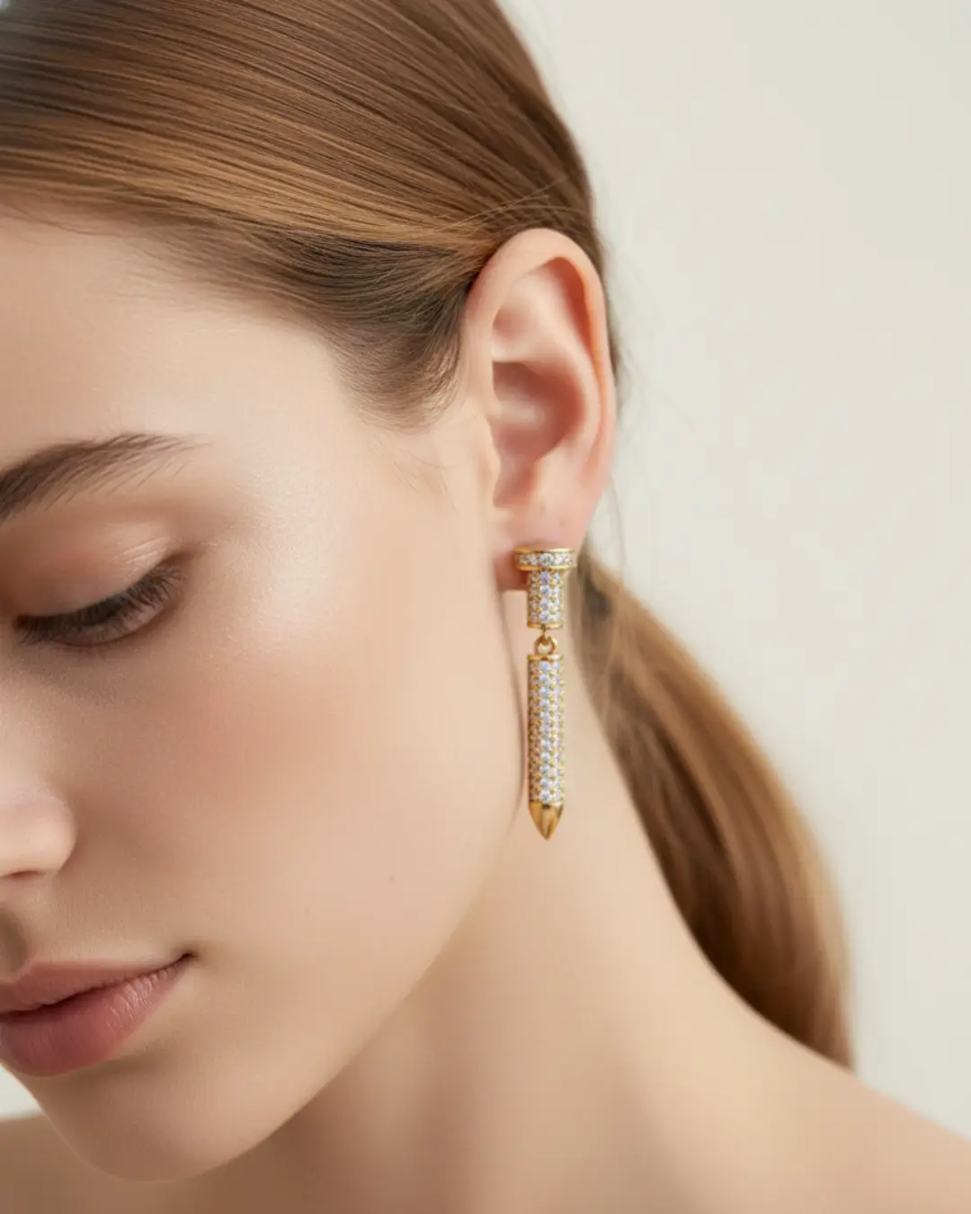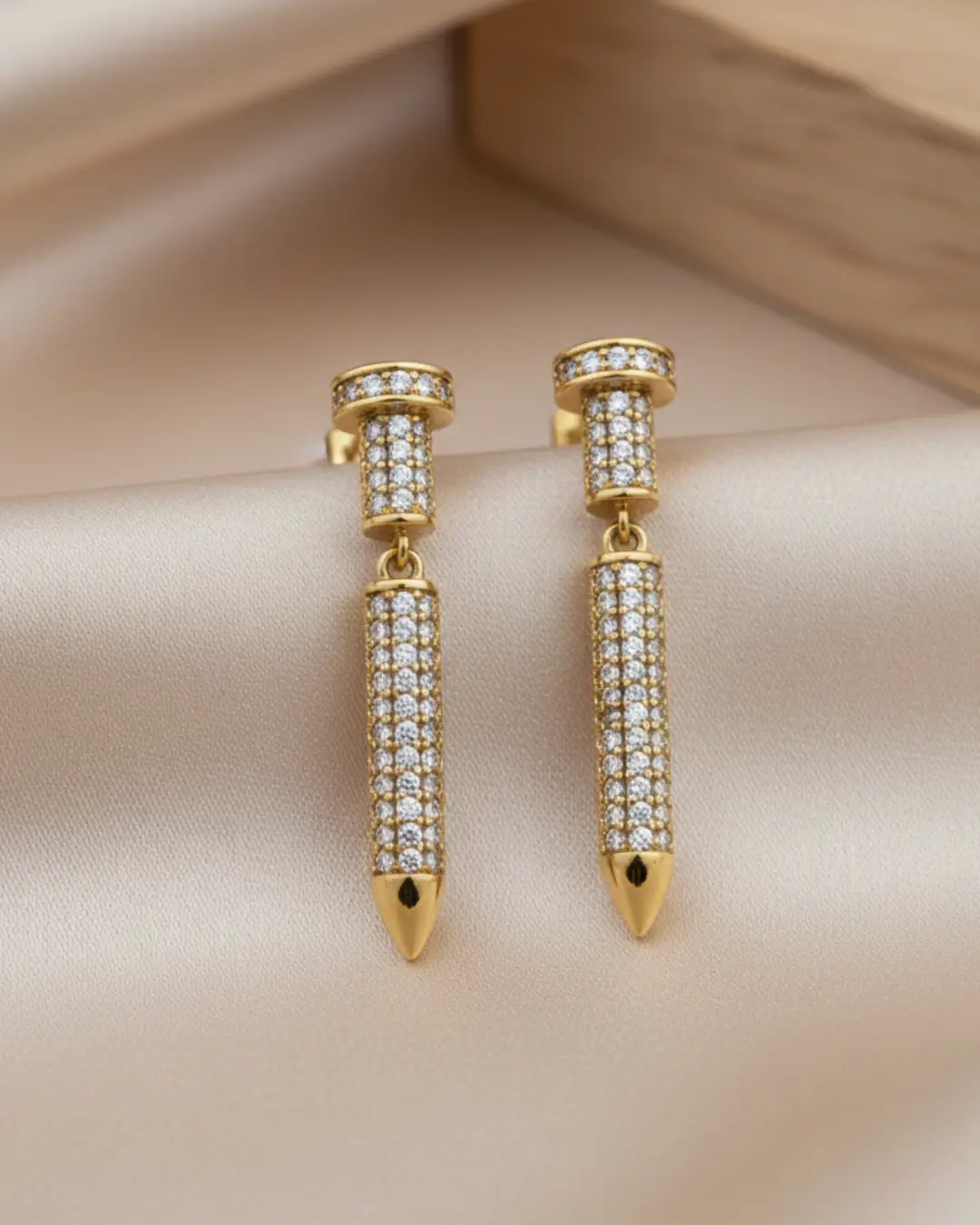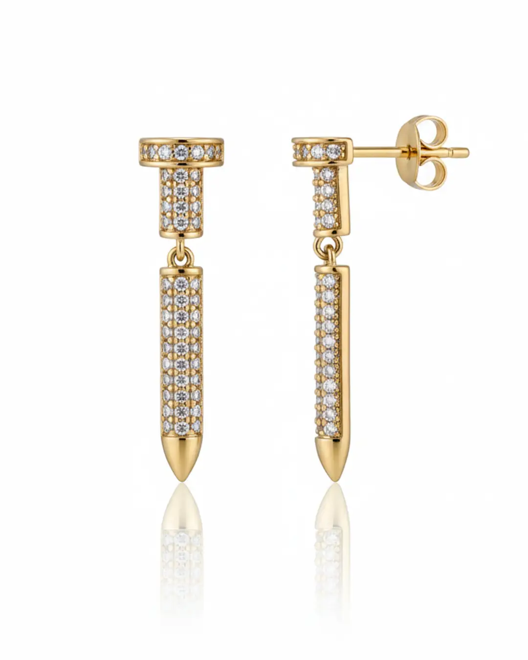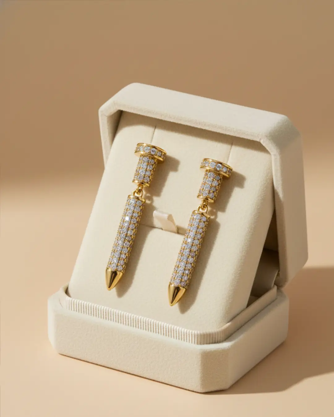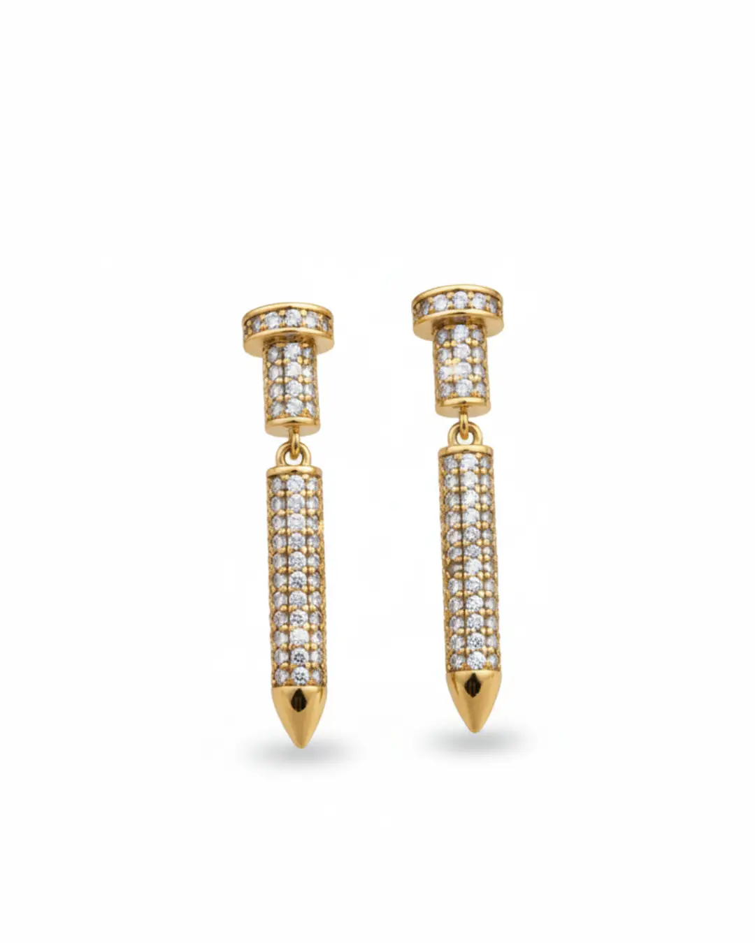 Make a sharp statement with our Apex Pavé Spike Drop Earrings. These avant-garde dangles feature a two-tiered architectural design: a cylindrical pavé-set stud that seamlessly transitions into a sleek, articulated drop spike. Every surface is meticulously encrusted with brilliant-cut crystals, catching the light from every angle, while the polished gold-tone finish provides a warm, opulent contrast. Perfect for the individual who wants to combine edgy, urban motifs with red-carpet glamour.