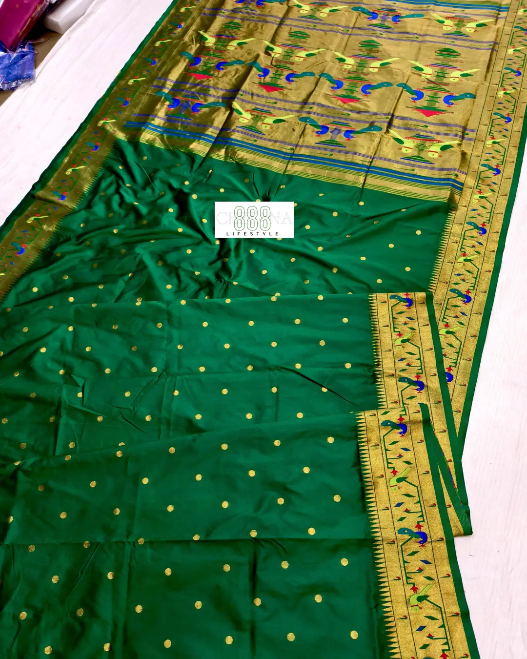 Bottle Green with Gold Border-Semi Mor Popat Brocade Paithani Saree