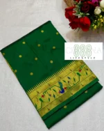 Be the first to review “Bottle Green with Gold Border-Semi Mor Popat Brocade Paithani Saree” Cancel reply