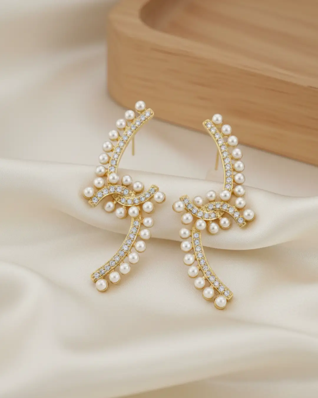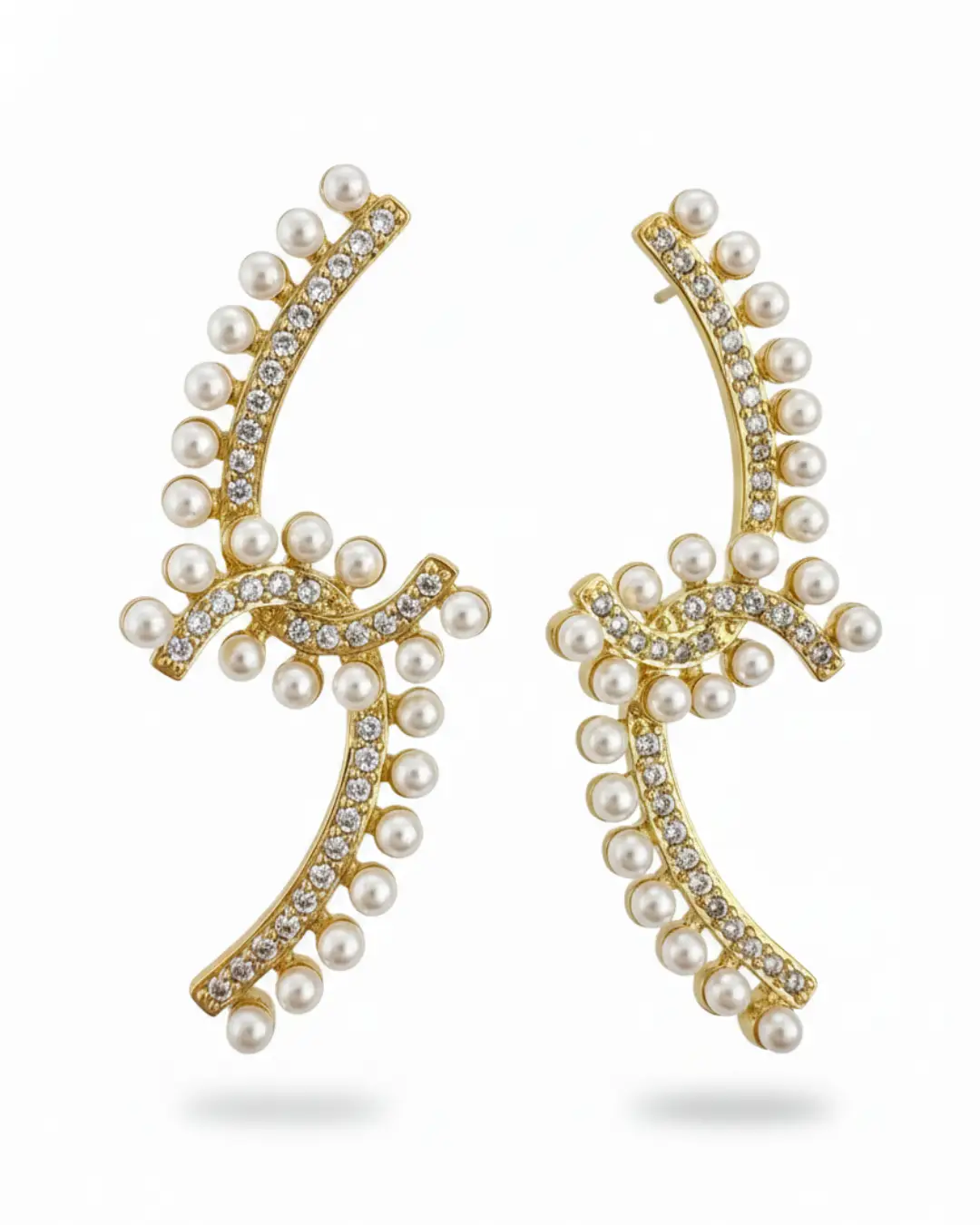 Elevate your jewelry collection with these Chanel Pearl & Crystal Pavé Ear Climbers. Featuring a striking curved silhouette, these earrings blend classic Parisian charm with a modern, “crawling” design. Each piece is centered by the unmistakable interlocking CC logo, meticulously encrusted with shimmering crystals and framed by a halo of lustrous glass pearls.