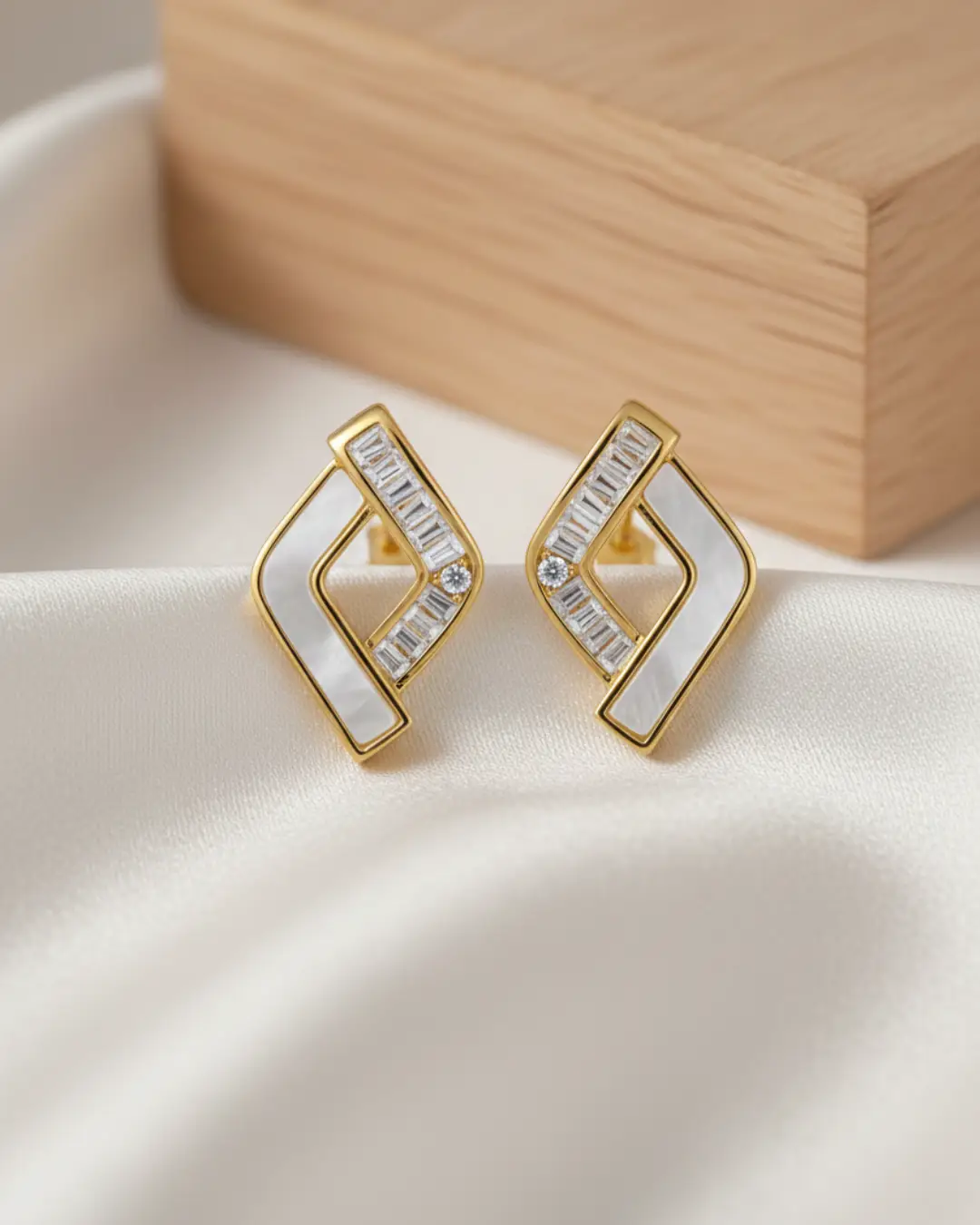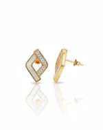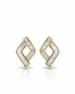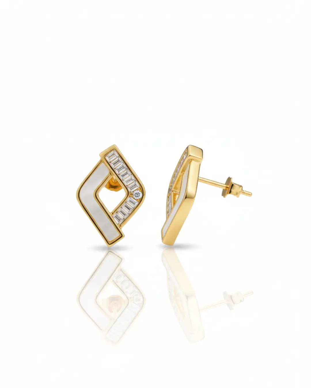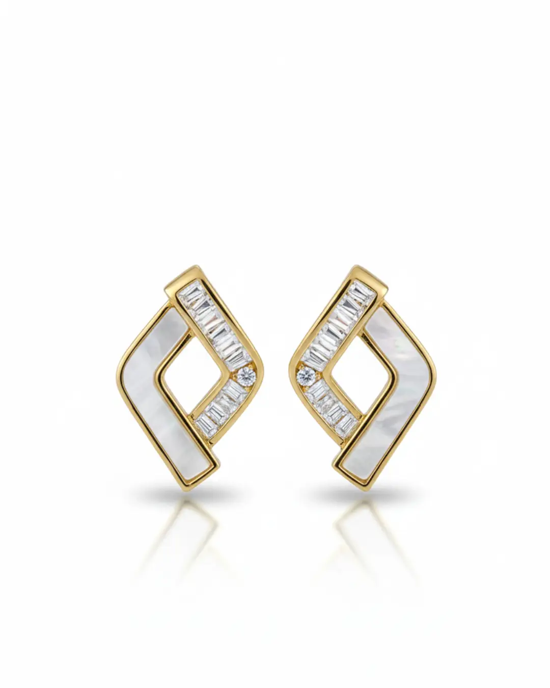 Each earring features a striking two-toned inlay. One side of the open rhombus is crafted from iridescent Mother of Pearl, offering a soft, natural glow. The opposing side is paved with precision-set baguette-cut zircons, anchored by a single brilliant-cut stone at the center for a high-impact sparkle.