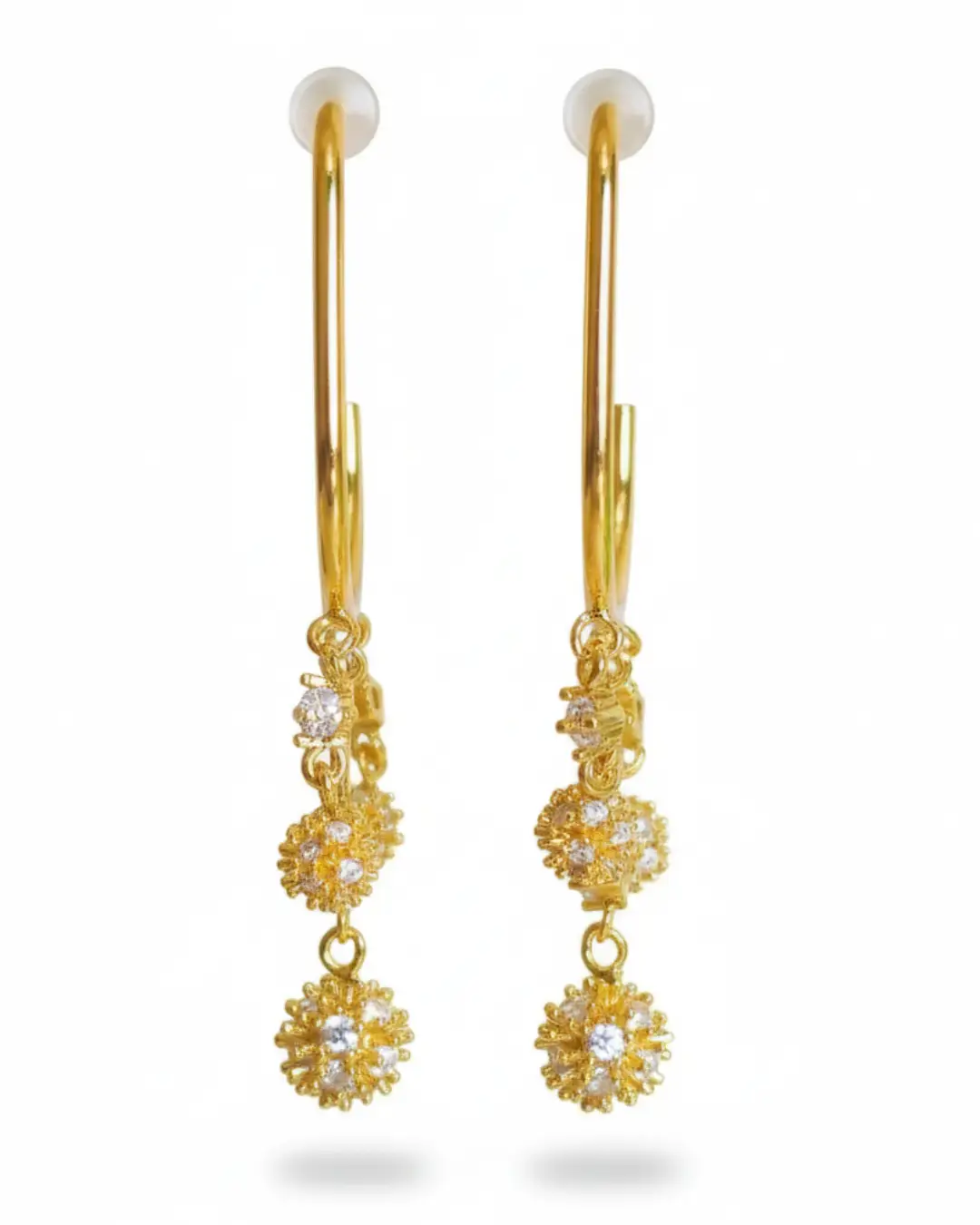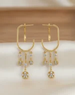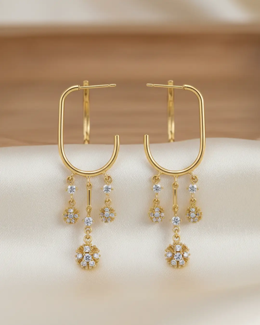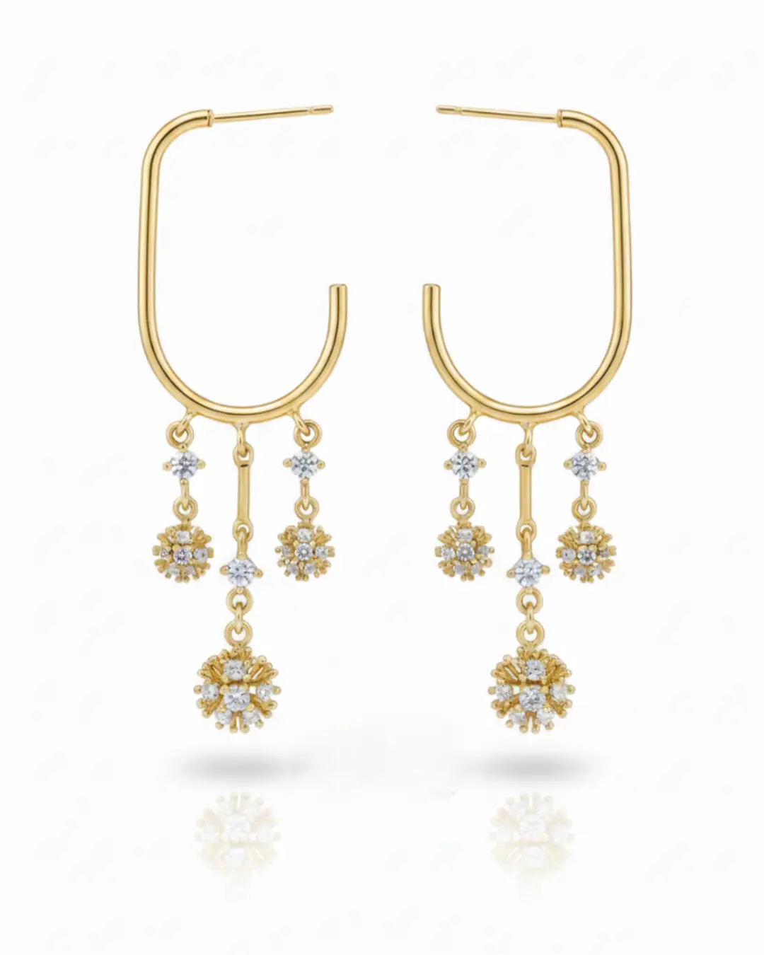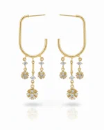 Radiate elegance with these Dancing Drops Earrings, a stunning fusion of geometric precision and floral-inspired brilliance. Crafted with a high-shine gold finish, these earrings feature a unique “pill” shaped hoop that provides a contemporary foundation for the delicate, shimmering charms that dance below. Features an elongated, open-oval hoop design for a sleek, modern aesthetic.