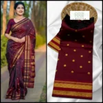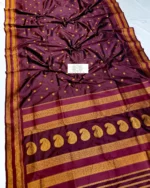 Draped in a sophisticated shade of deep wine, this saree seamlessly blends traditional craftsmanship with modern comfort. The lustrous half-silk fabric offers a beautiful sheen and a graceful drape, making it an ideal choice for weddings, festivals, and formal gatherings.
