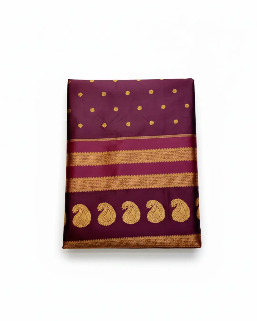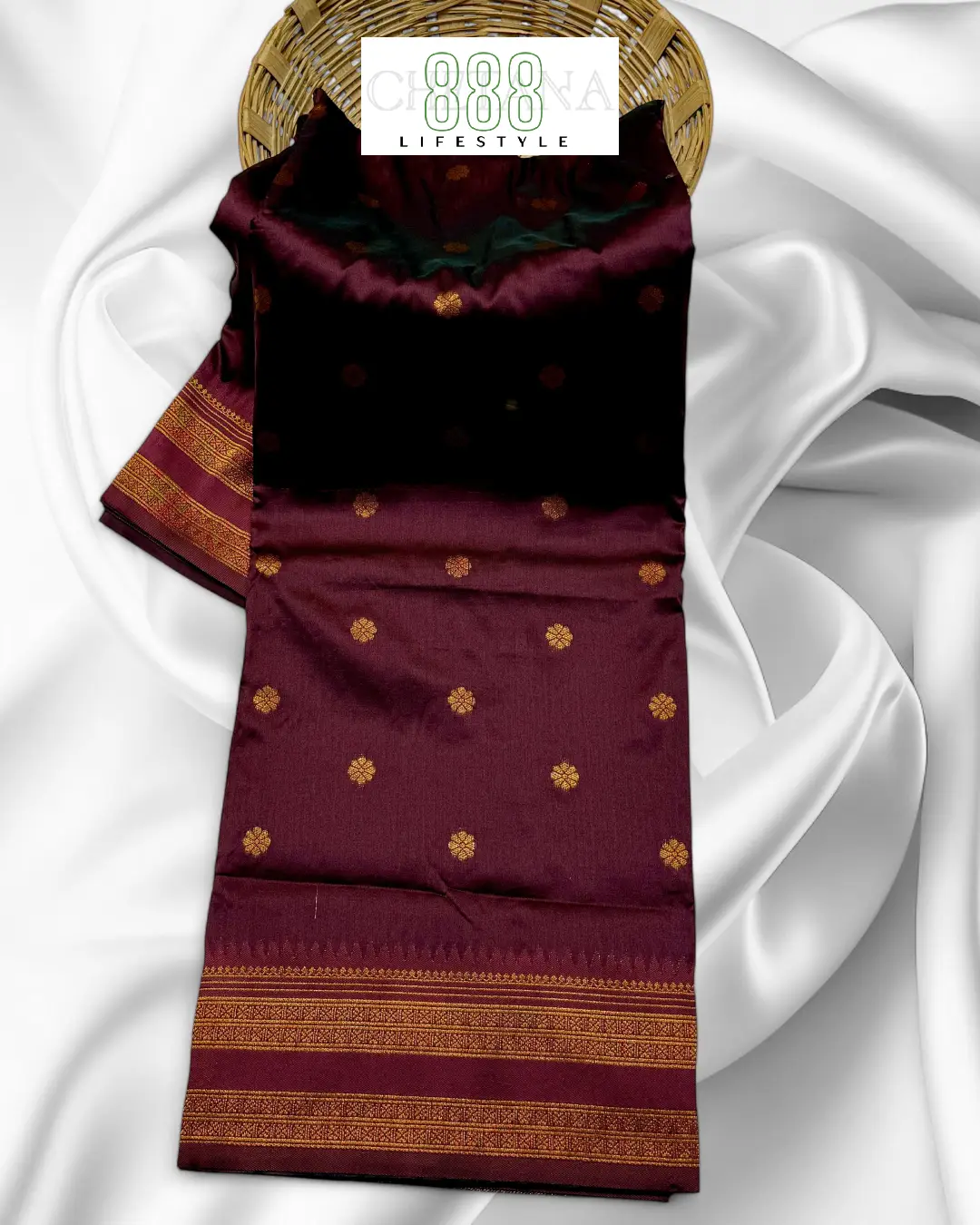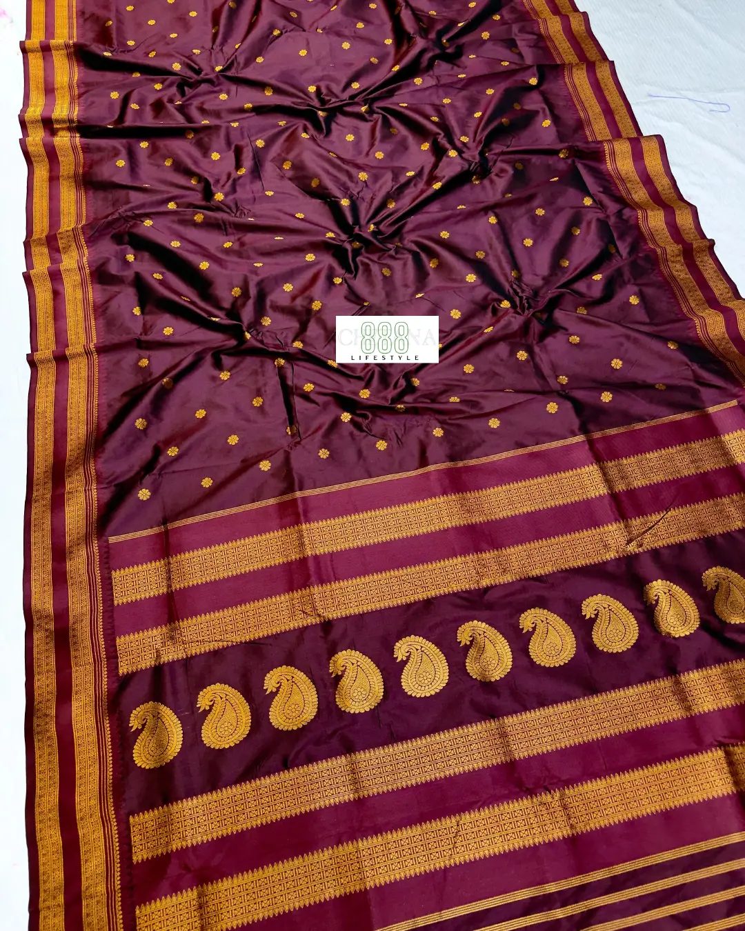 Body: The rich wine-colored base is adorned with delicate gold zari floral buttas (small motifs) that catch the light with every movement.