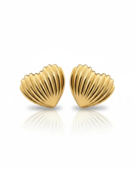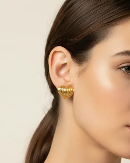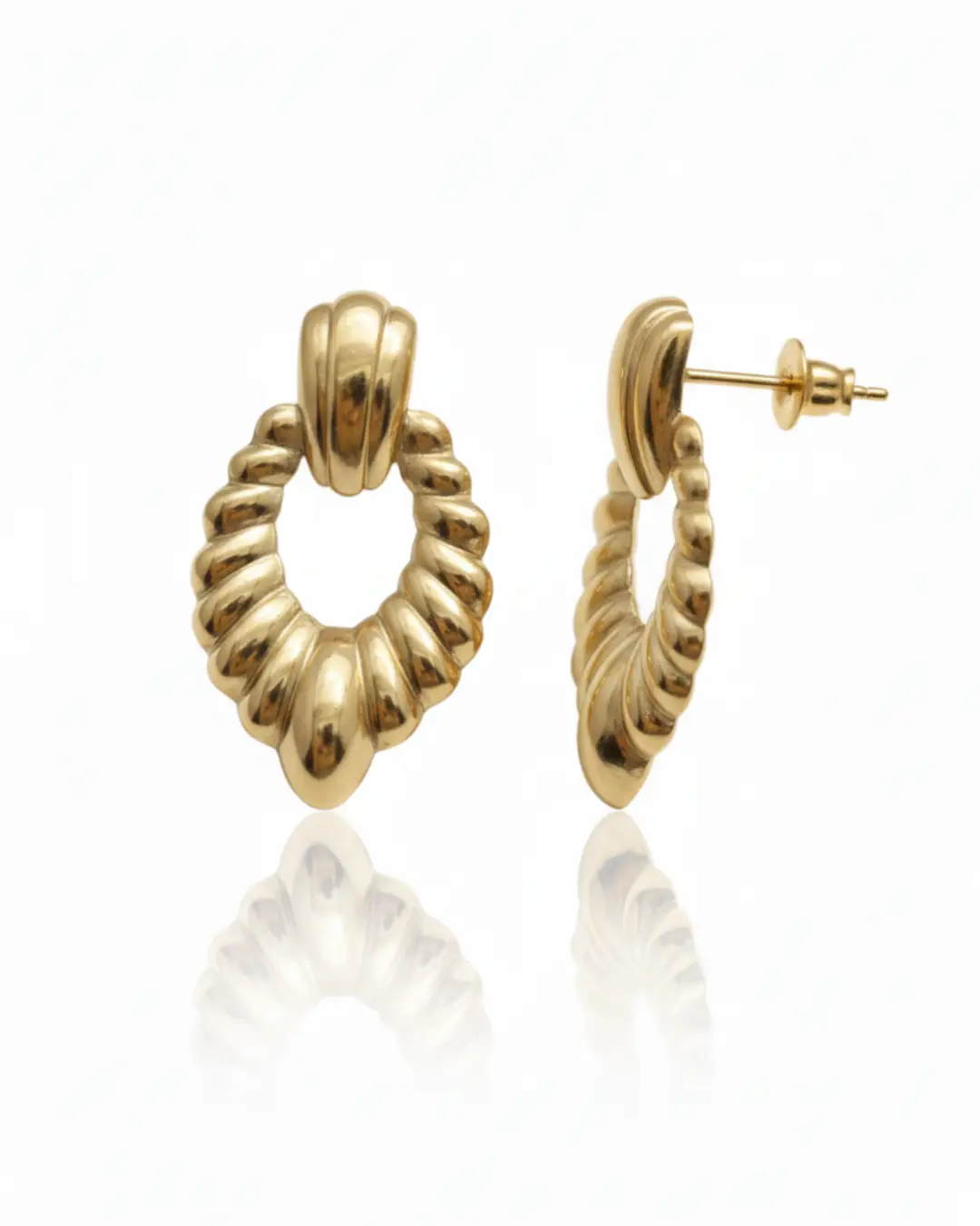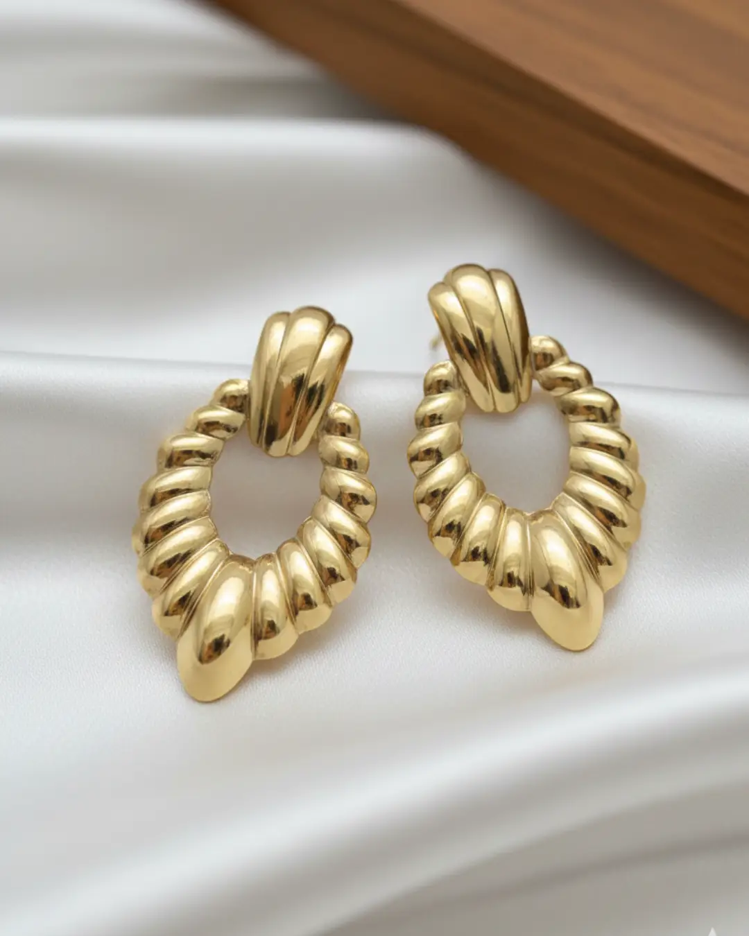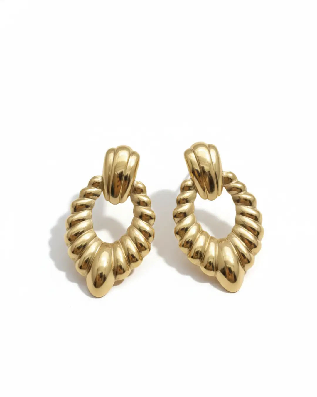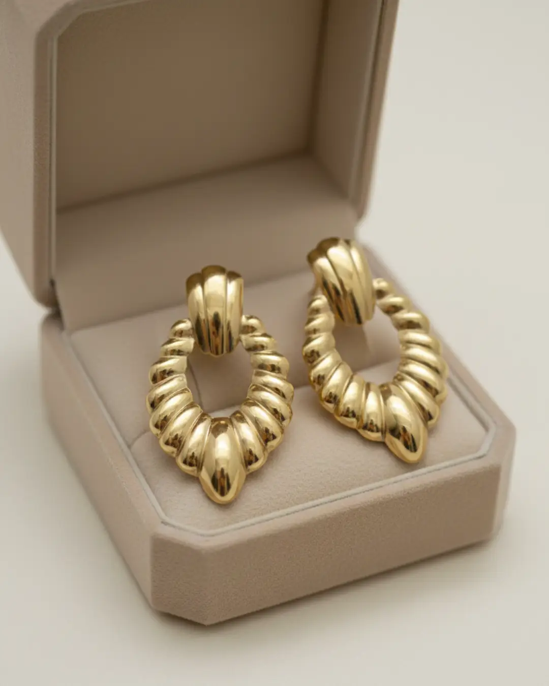 The unique “croissant” or “shrimp” style ribbing adds a sophisticated architectural depth to the traditional gold hoop. Suspended from a sleek, polished stud, the teardrop-shaped rings offer a graceful movement that transitions seamlessly from a high-powered office look to an elegant evening out.