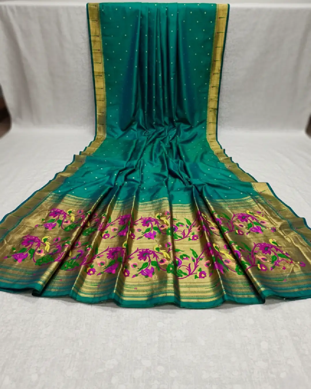 Dual Tone Peacock Green with Rich Gold Border Muniya Paithani Saree