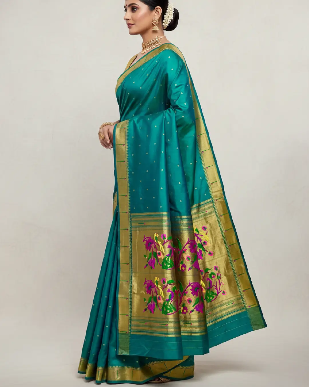 Home Sarees Gauri Muniya Paithani Dual Tone Peacock Green with Rich Gold Border Muniya Paithani Saree