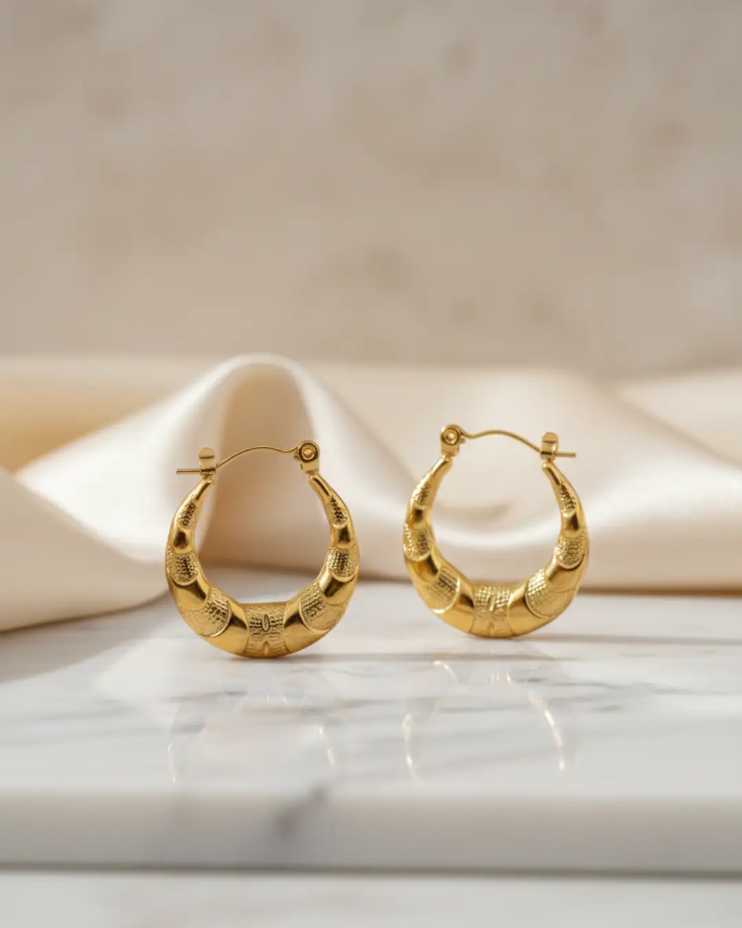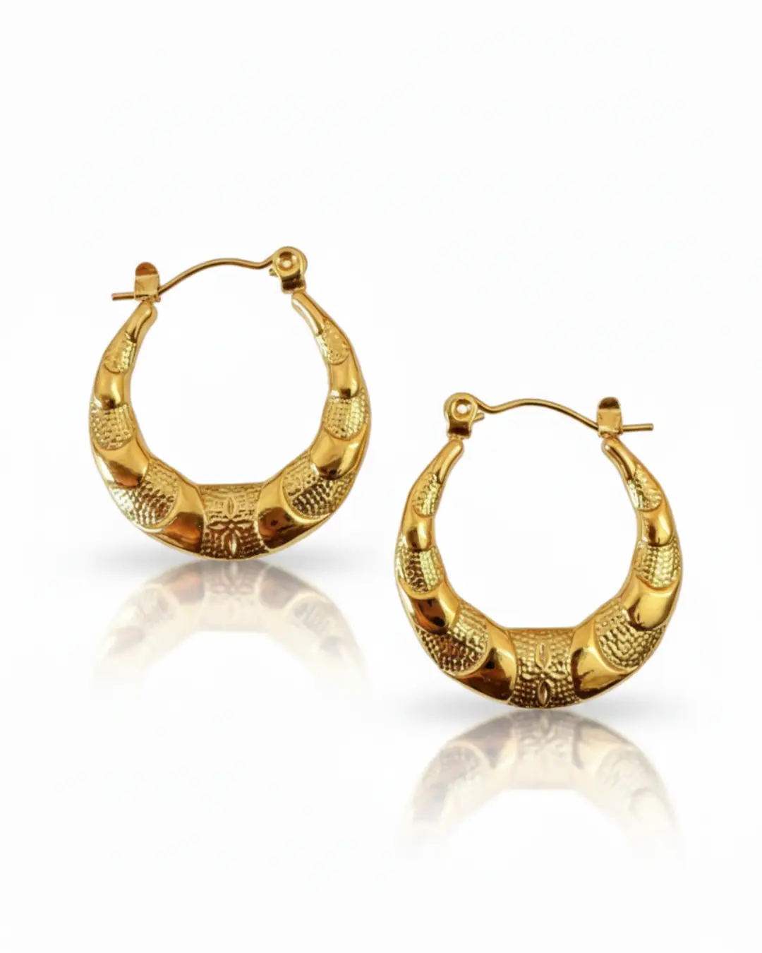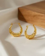 The Ember Dotted Crescent Hoops offer a rich, tactile aesthetic for those who love bold, vintage-inspired jewelry. These thick, crescent-shaped hoops feature an intricate pebbled texture across the main body, framed by smooth, polished tips. The dense texturing provides a shimmering glow that mimics the look of a pavé setting, making them a perfect standalone statement piece.
