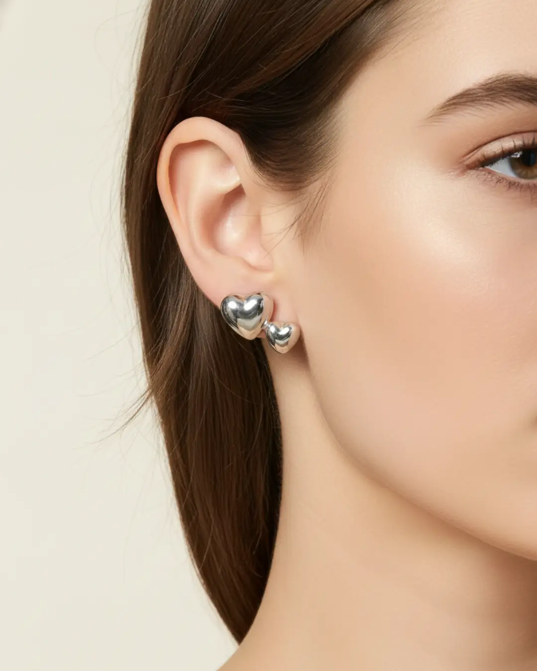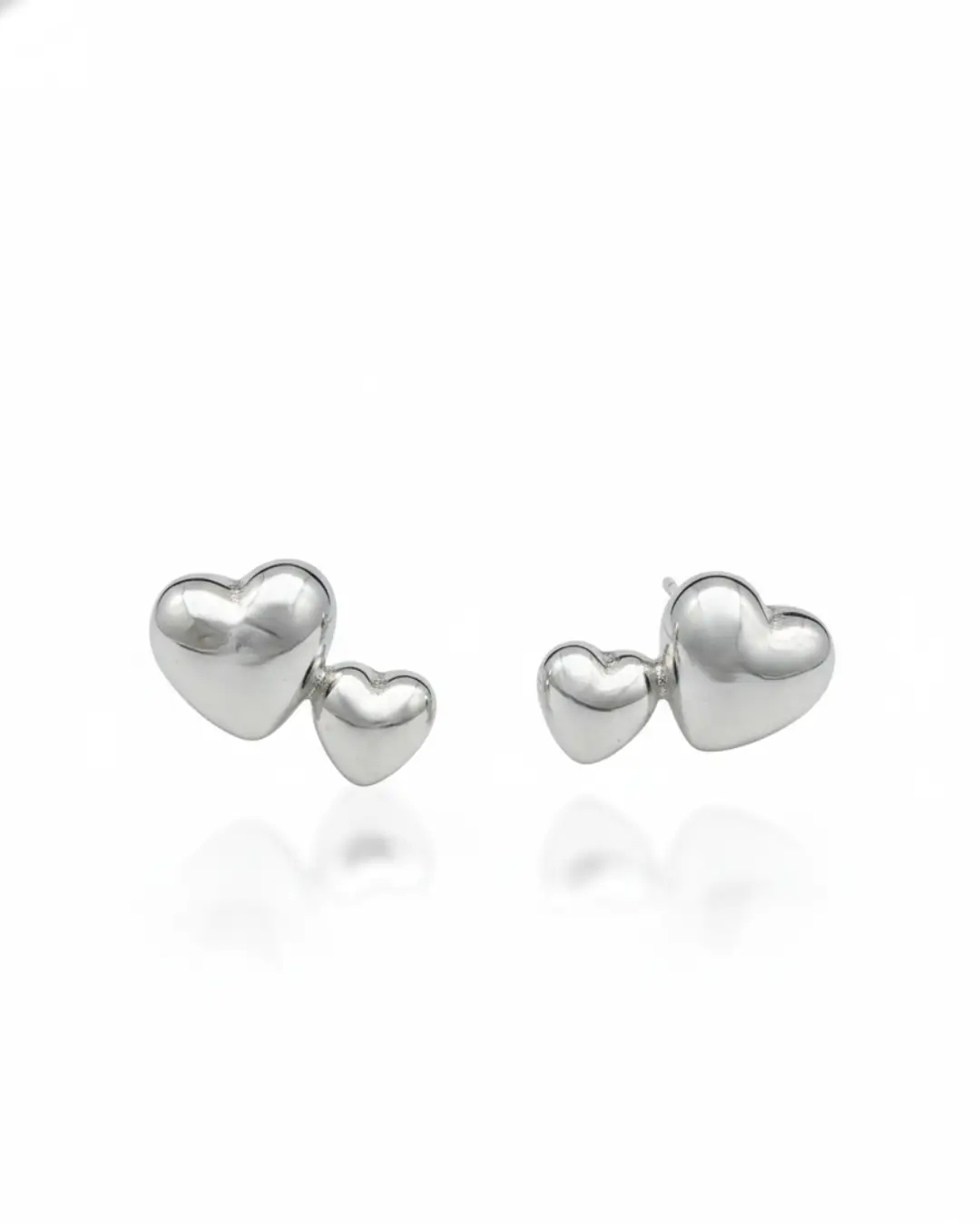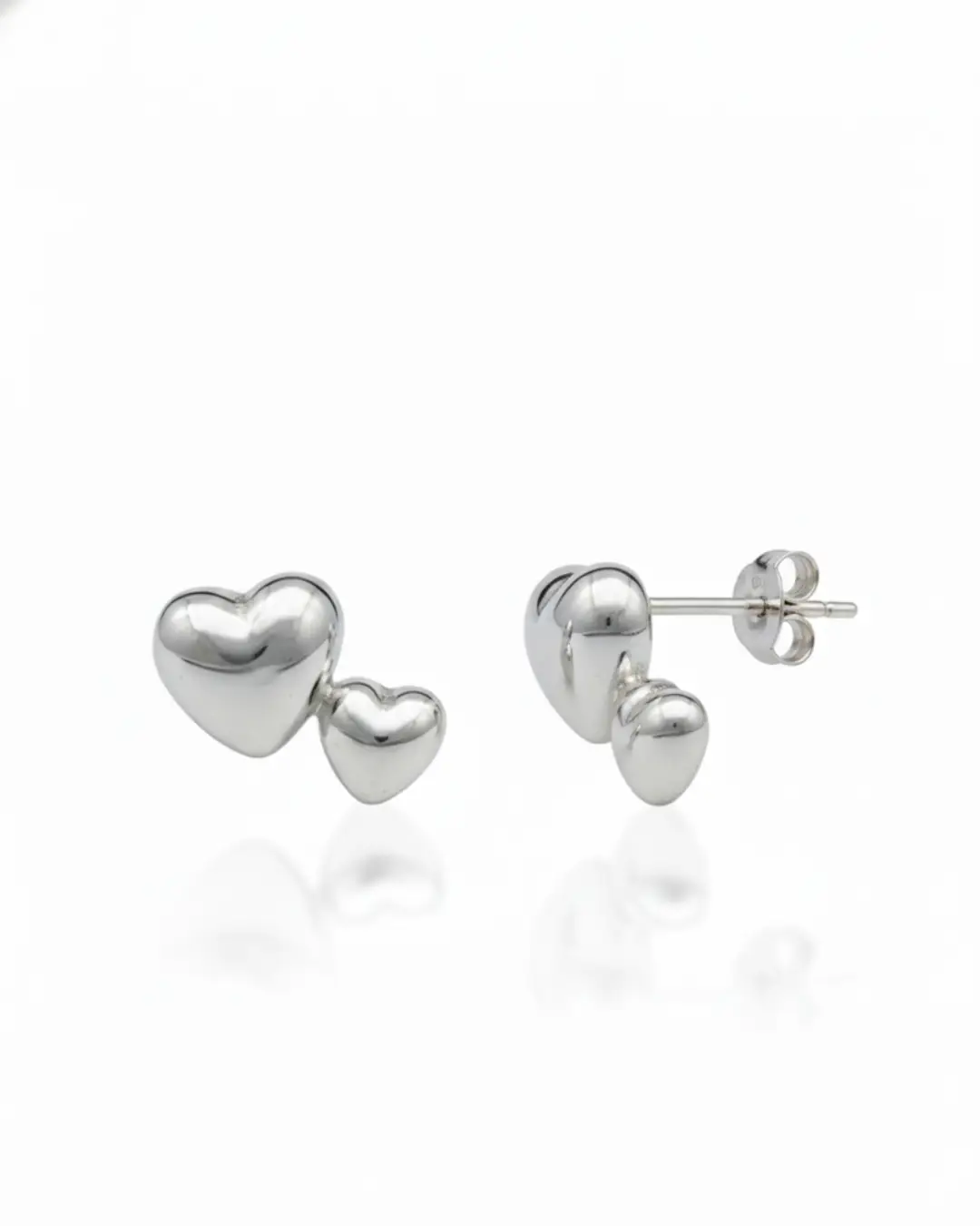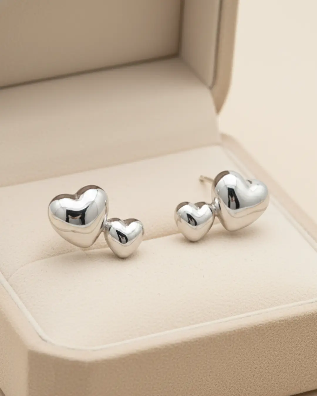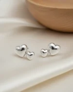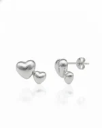 Double the love with these charming duo-heart stud earrings. Featuring a larger puffed heart gracefully paired with a smaller companion, these earrings symbolize inseparable bonds and shared moments.