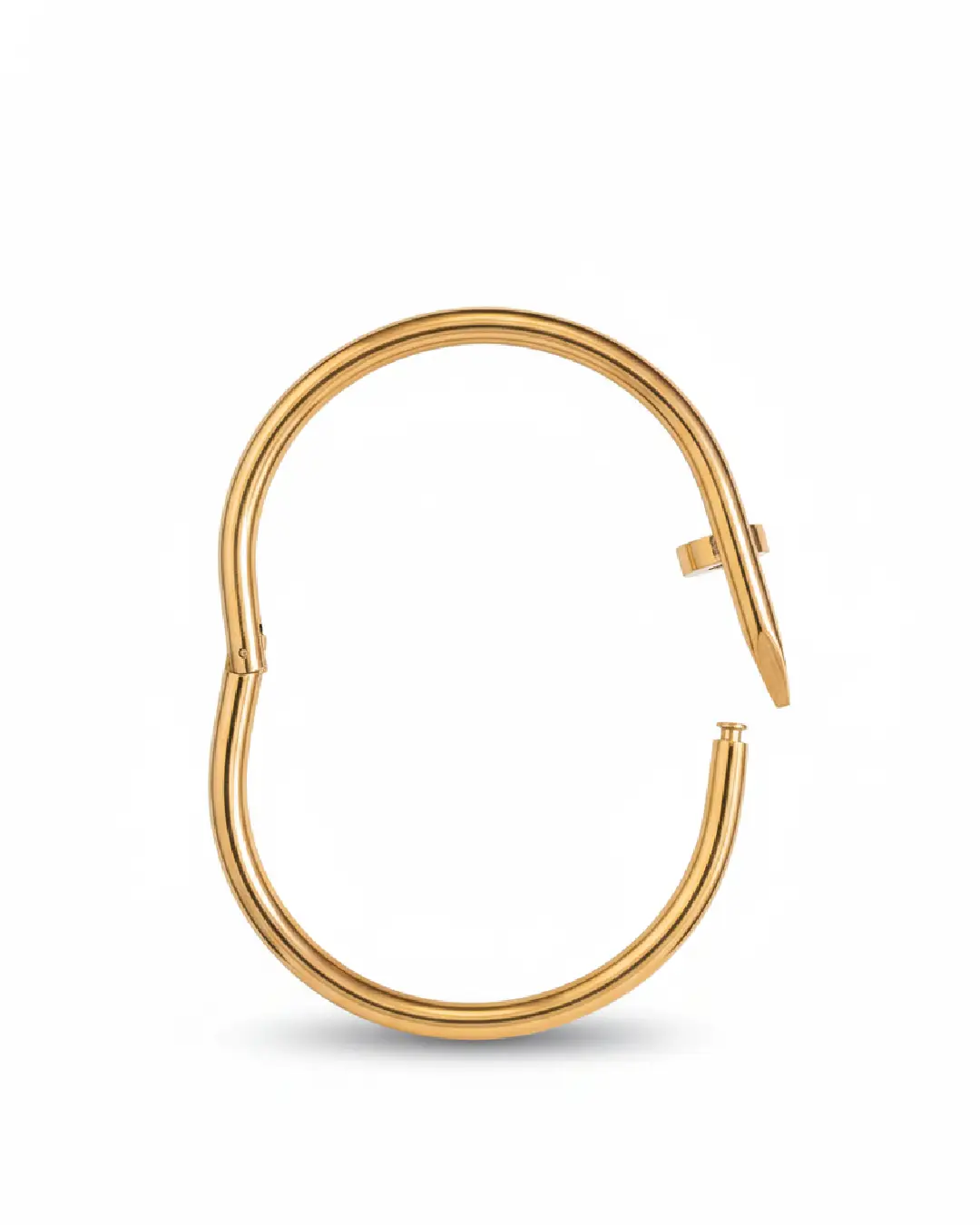 Break the mold with a silhouette that finds beauty in the unexpected. This Forge Nail Gold Bangle Bracelet reimagines the humble nail as a sophisticated, wrap-around statement piece. Crafted with a high-shine finish and a seamless hinge, it’s designed for those who prefer their elegance with a bit of an attitude. The iconic “bent nail” motif creates a continuous, fluid loop that rests comfortably against the wrist.