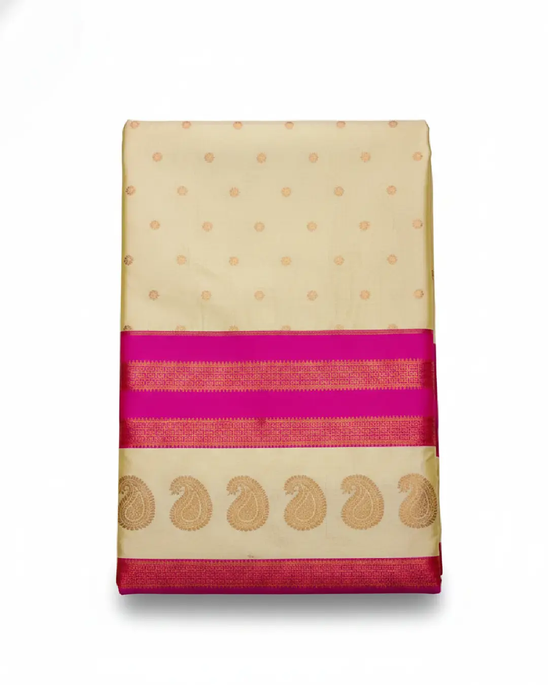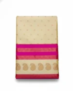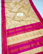 • Color Palette: A sophisticated Golden Beige/Cream body contrasted by a vibrant Magenta/Rani Pink border and pallu.