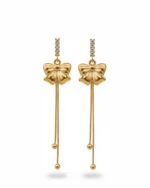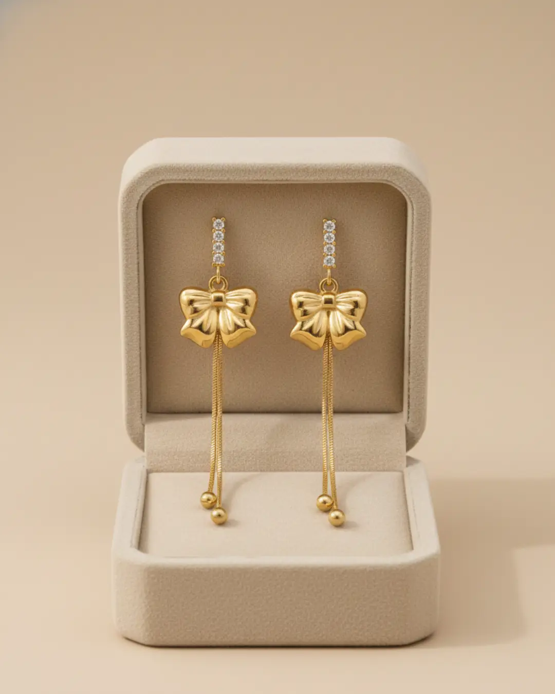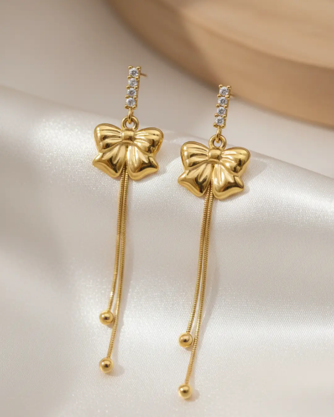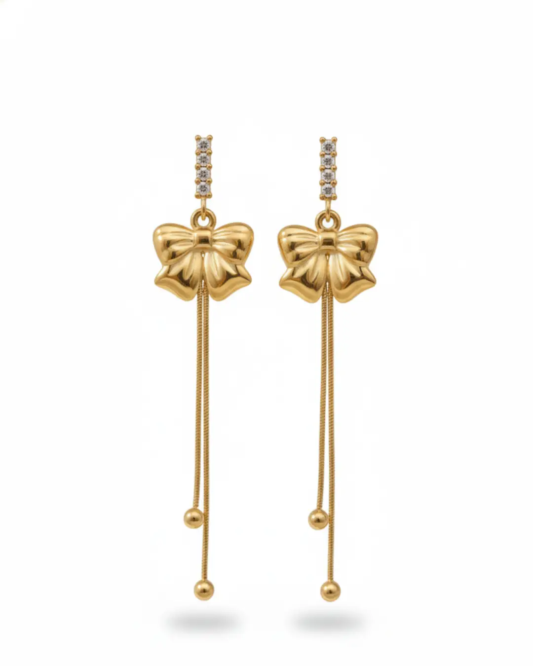 Elevate your jewelry collection with these Golden Bow Tassel Drop Earrings. Designed for those who appreciate “Coquette” aesthetics with a modern twist, these earrings transition seamlessly from a day at the office to an elegant evening out. The vertical bar at the post is encrusted with brilliant-cut crystals, leading down to a graceful bow and delicate dangling chains that catch the light with every movement.