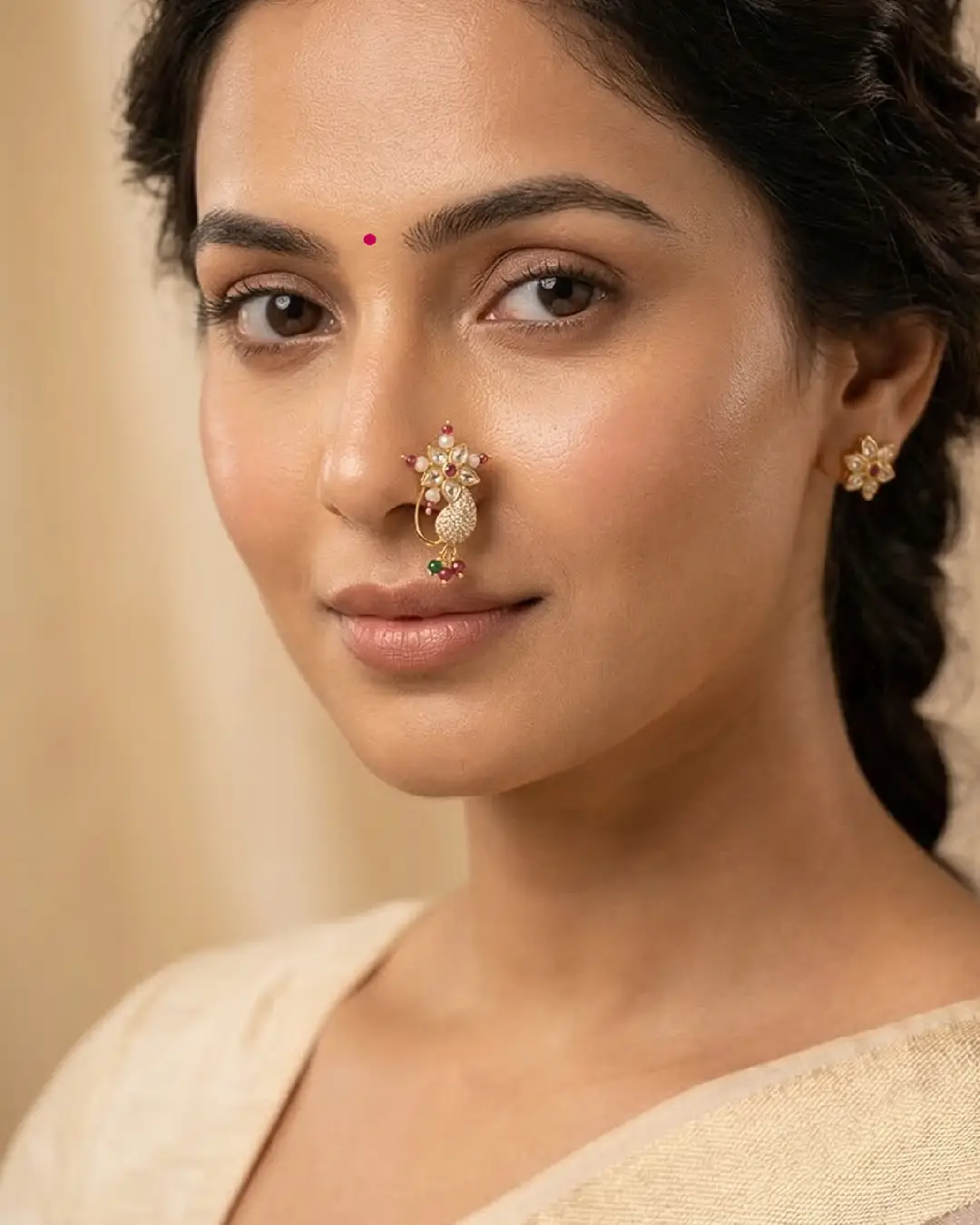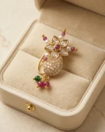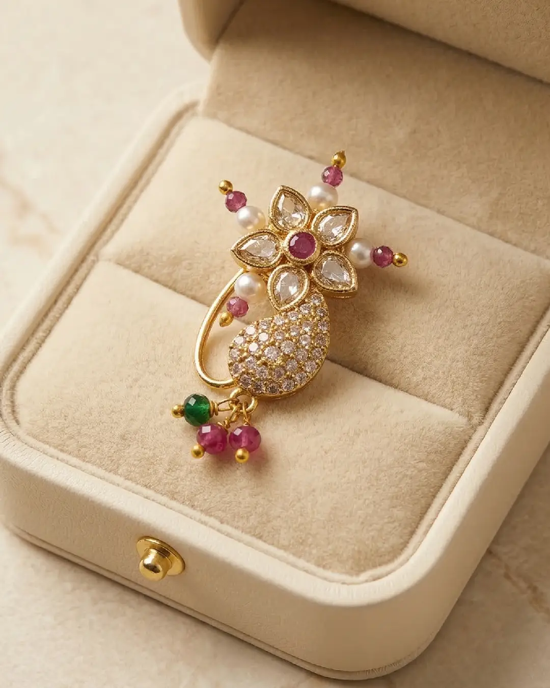 Featuring a stunning floral Polki centerpiece and a shimmering Kalki (paisley) motif encrusted with brilliant white stones, this gold-plated nose ring is accented with delicate pearls and vibrant ruby-green beads. Perfect for the bride who cherishes heritage.