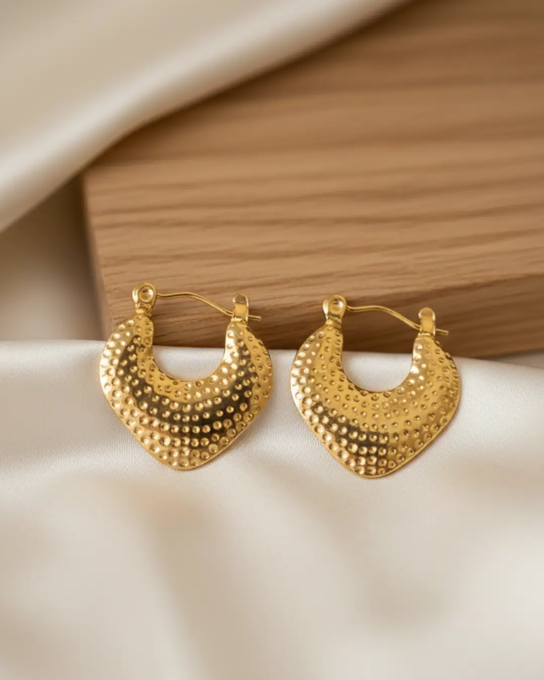 Designed with a wide, tapered crescent shape and a meticulous hand-hammered finish, these earrings offer a sophisticated blend of modern geometry and bohemian charm. The dimpled surface creates a shimmering effect with every movement, making them the perfect statement piece that remains lightweight enough for all-day wear.