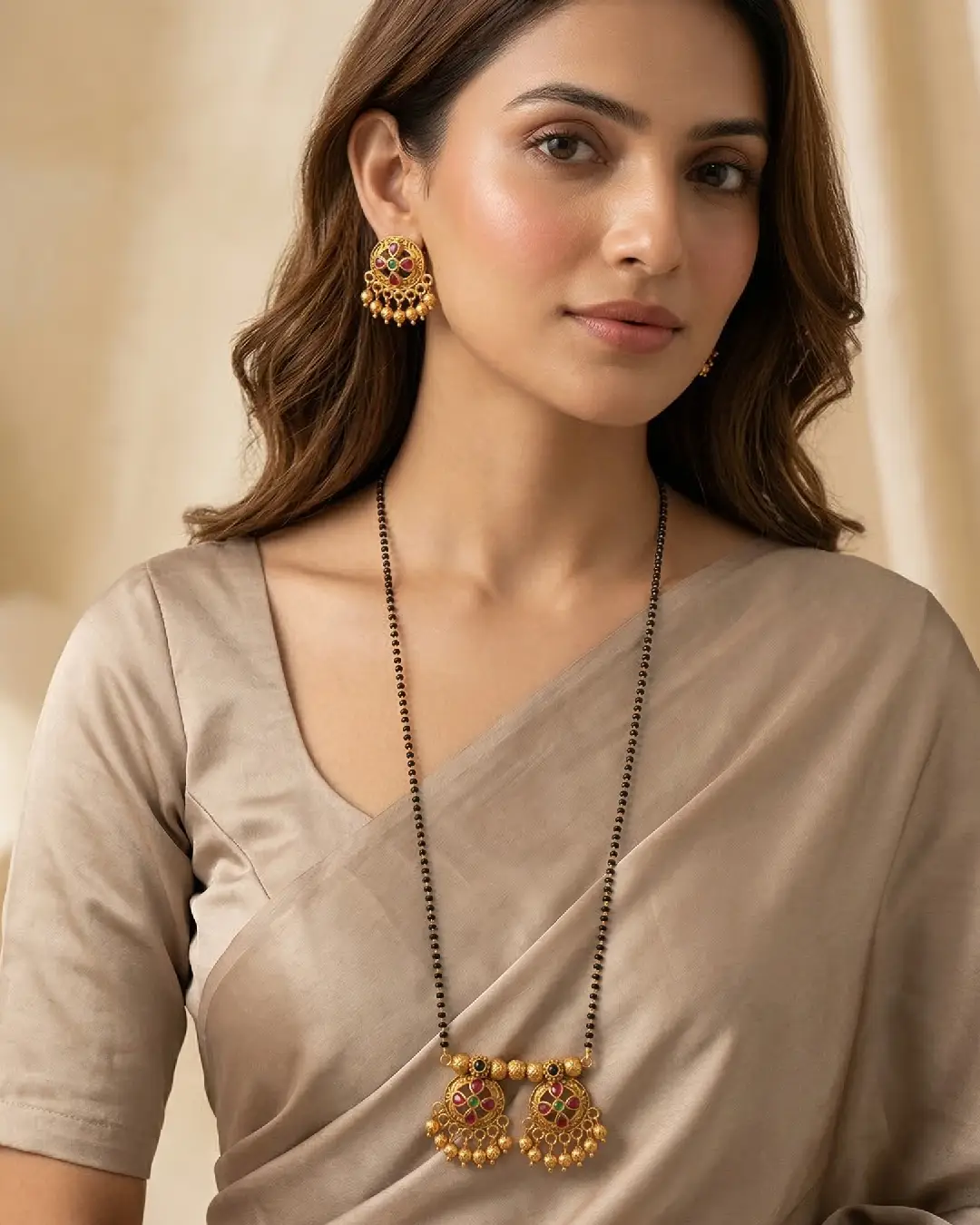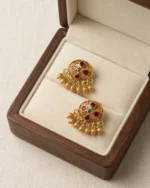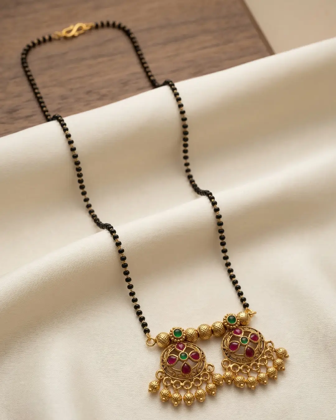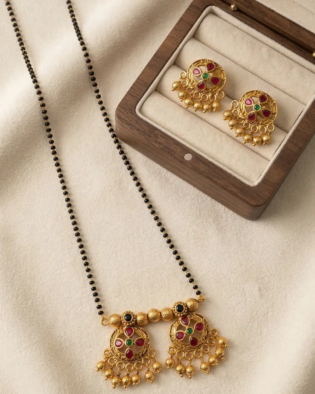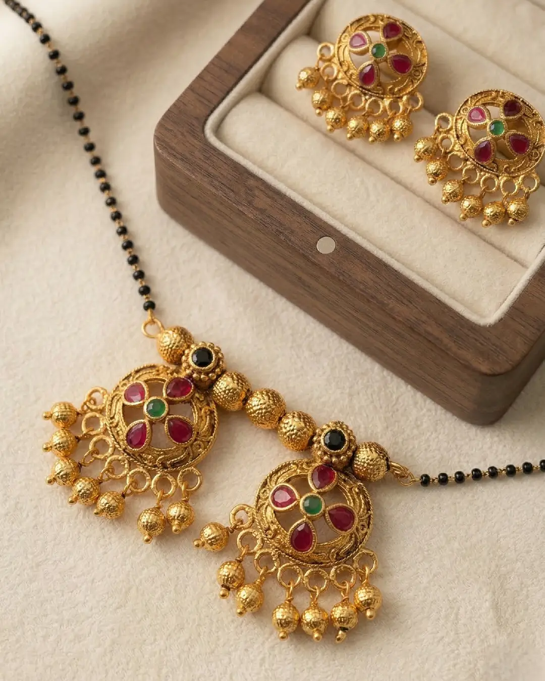 Features two intricately carved circular “Wati” pendants with delicate gold bead droplets (ghungroos). Hand-set with high-quality kemp-style red and green stones for a traditional “Temple Jewelry” look. Strung on a sturdy double-layered chain of auspicious black beads, believed to ward off the evil eye. Includes a pair of matching floral-motif stud earrings to provide a cohesive, polished look. The antique matte-gold finish ensures it pairs perfectly with silk sarees, lehengas, or even fusion ethnic wear.