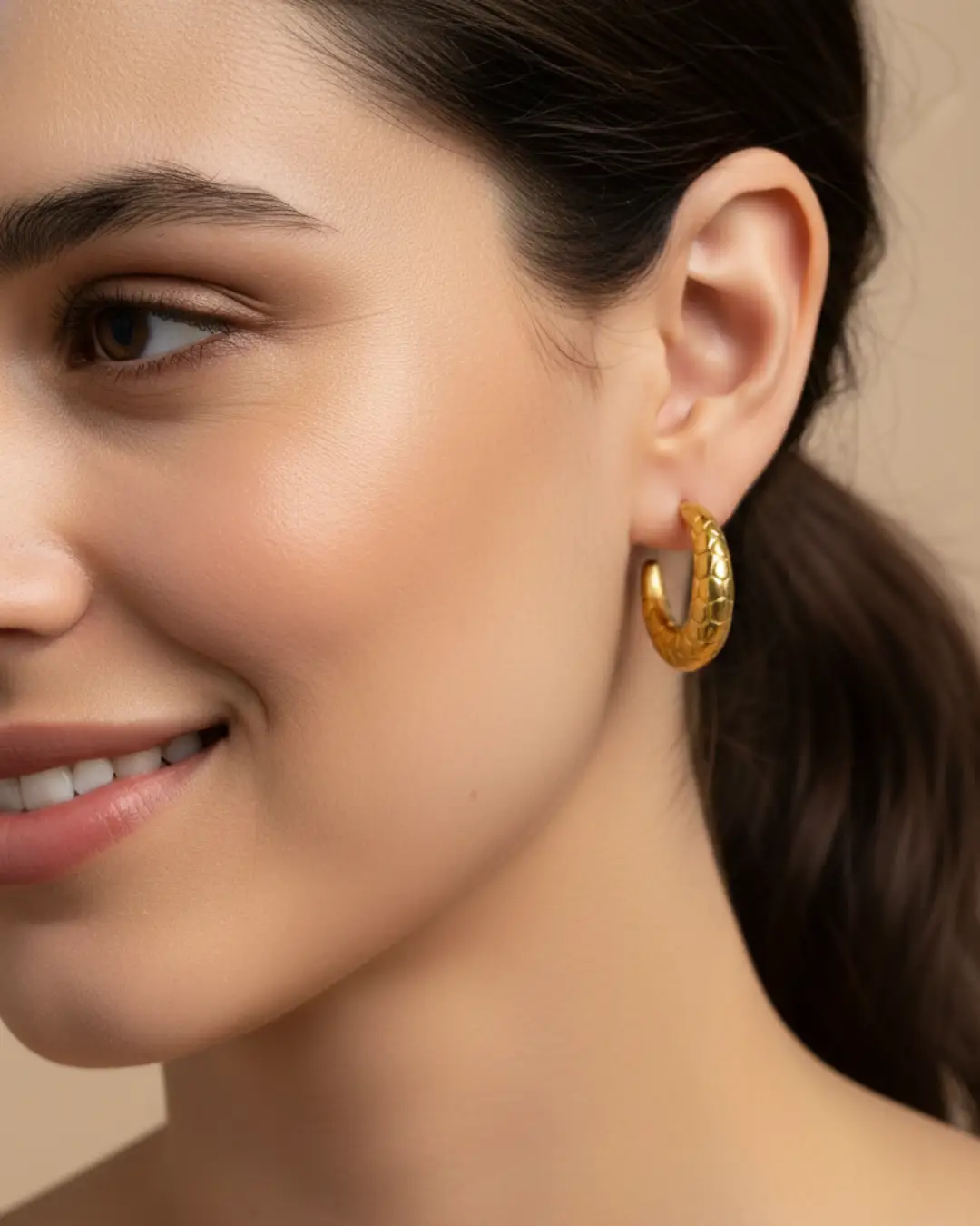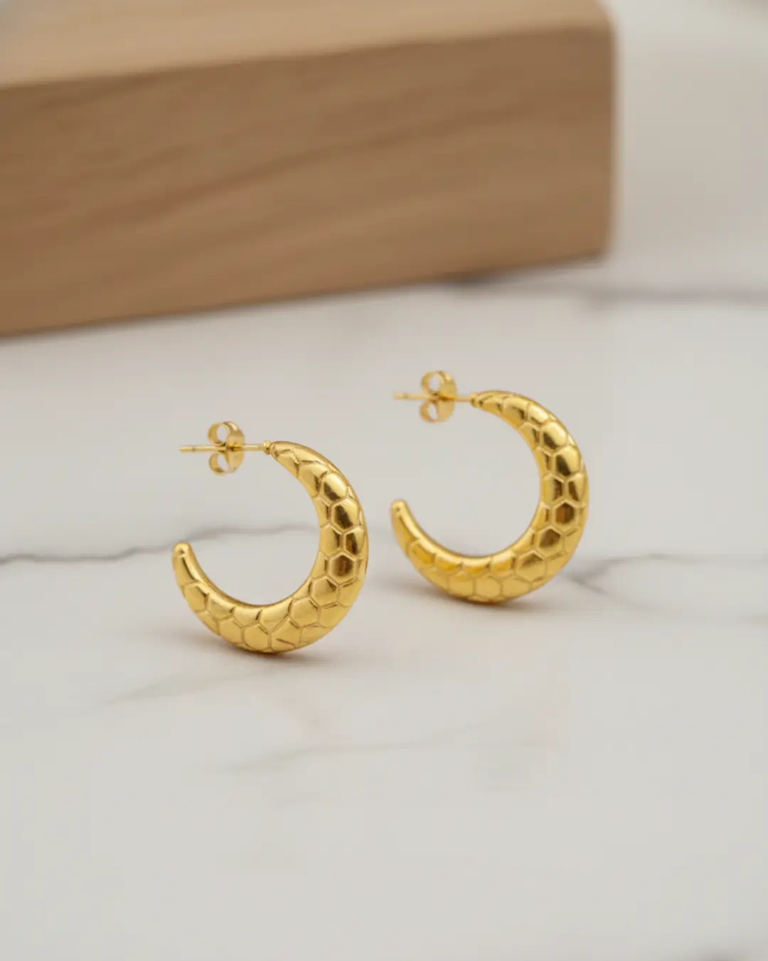 These stunning earrings feature a bold, tapered crescent silhouette meticulously embossed with a geometric honeycomb pattern. The textured surface catches the light from every angle, offering a rich, dimensional glow that traditional smooth hoops lack.