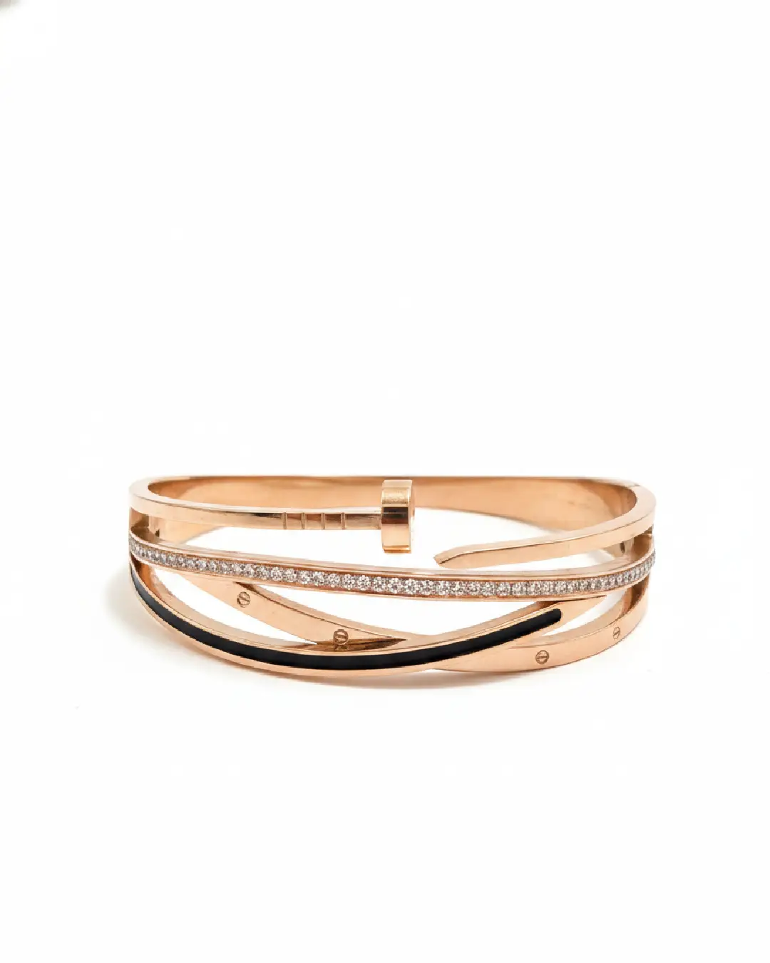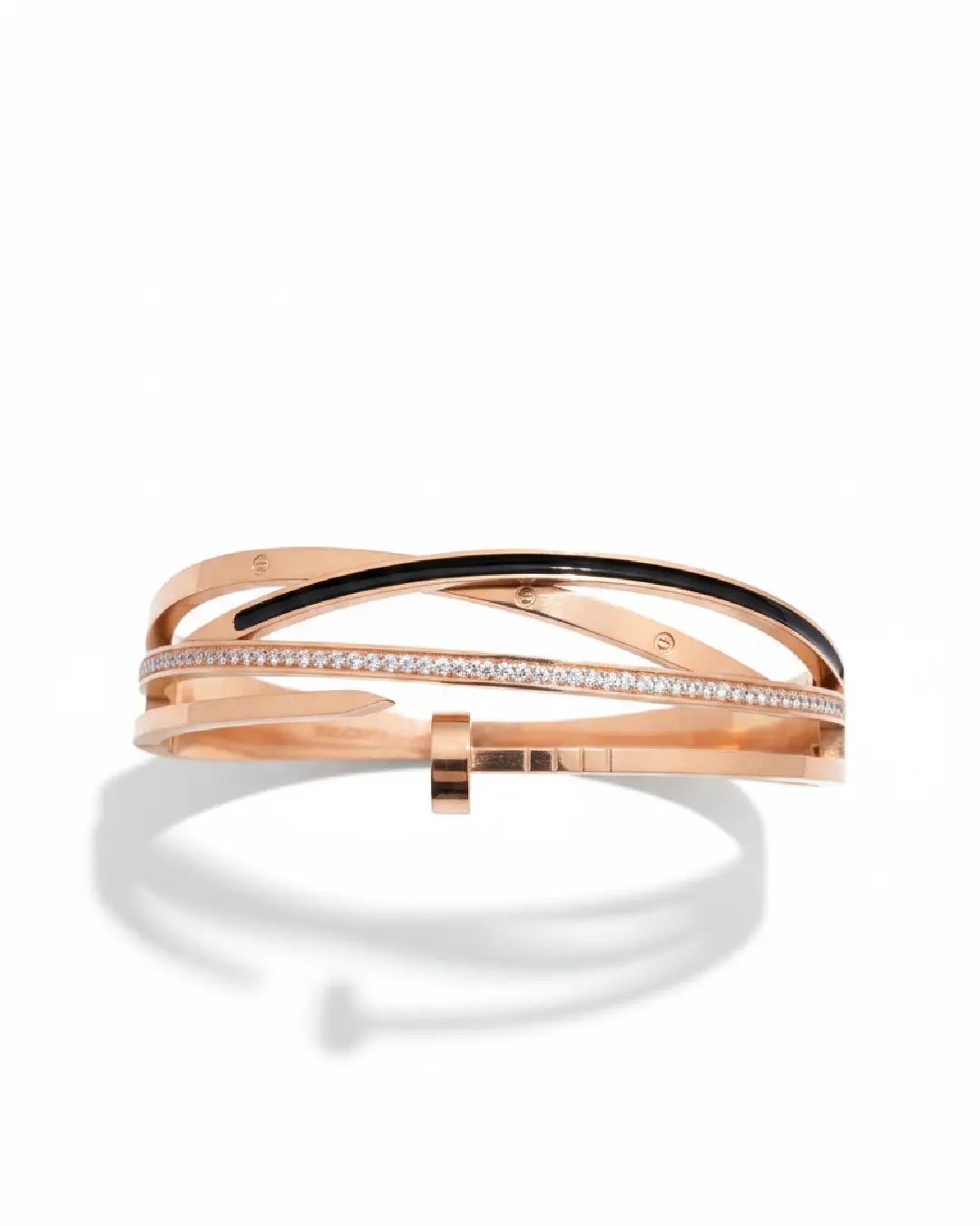 This isn’t just a bracelet; it’s a sculptural narrative of contrast. A single, stylized nail motif anchors the design, gracefully spiraling into four distinct, intersecting bands.