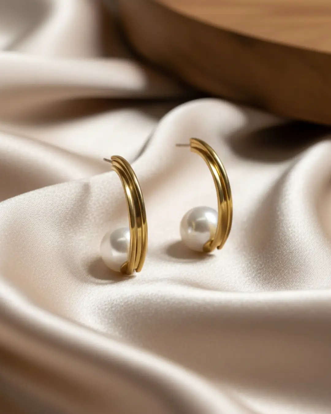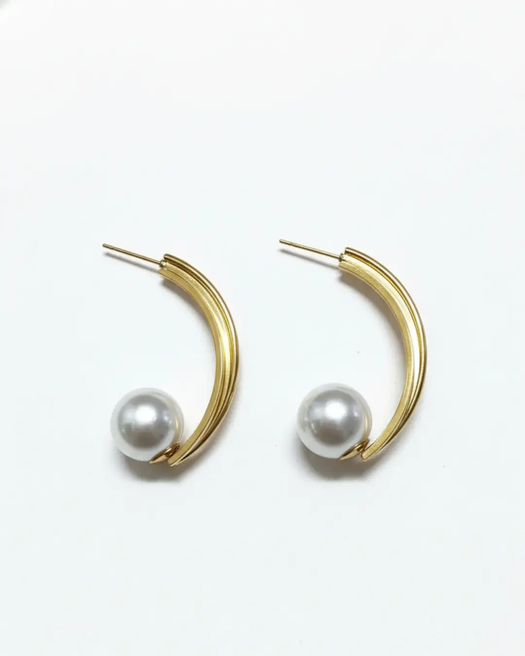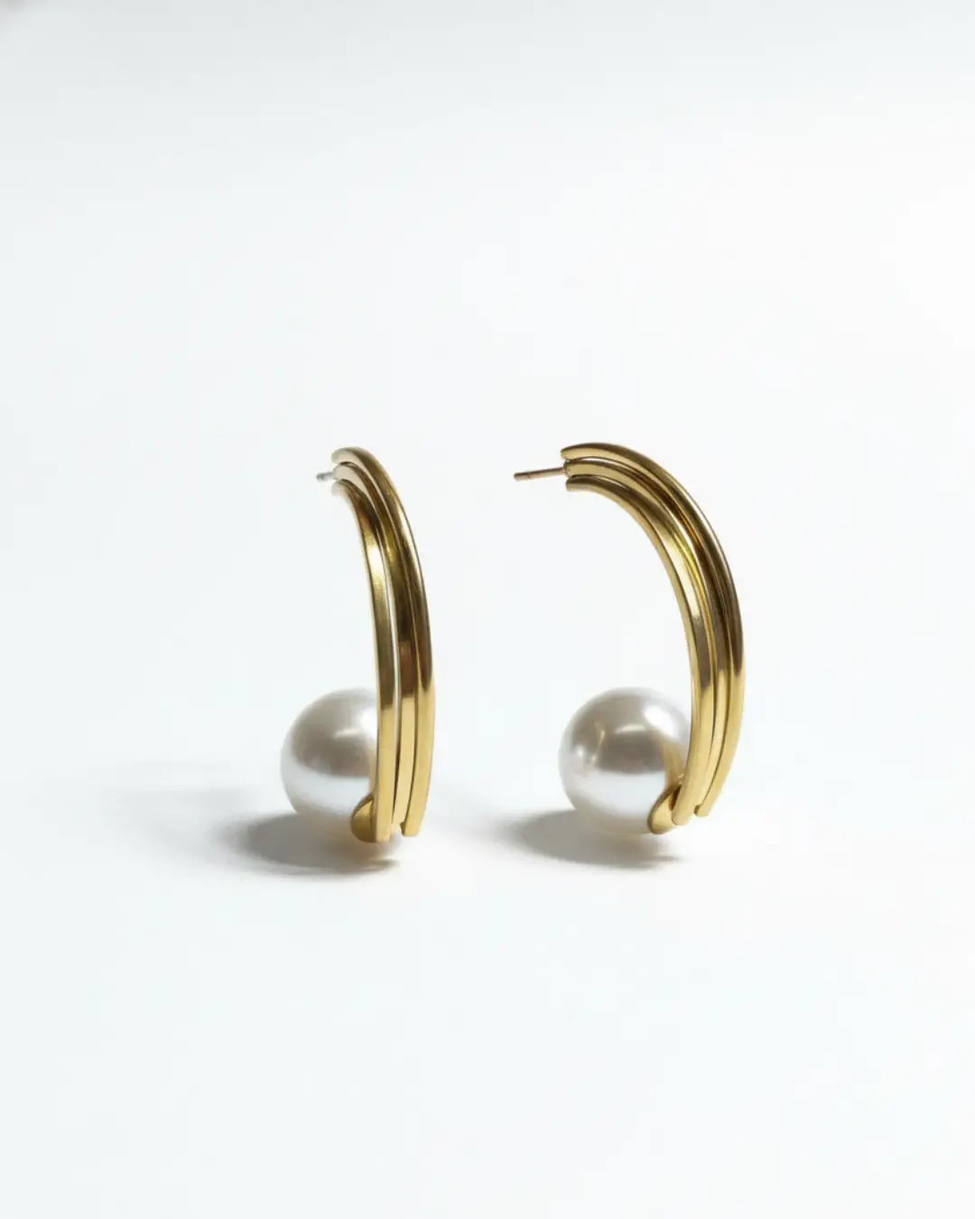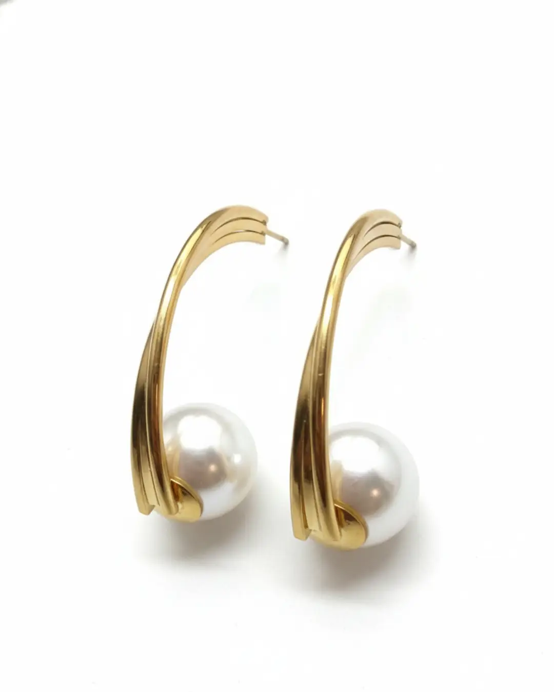 Redefine modern elegance with our Orbital Pearl Earrings. This avant-garde design features a sleek, triple-contoured gold band that arcs gracefully around a singular, high-luster oversized pearl. The juxtaposition of the structured, architectural gold lines with the soft, organic sphere of the pearl creates a balanced statement piece that is both bold and timeless.