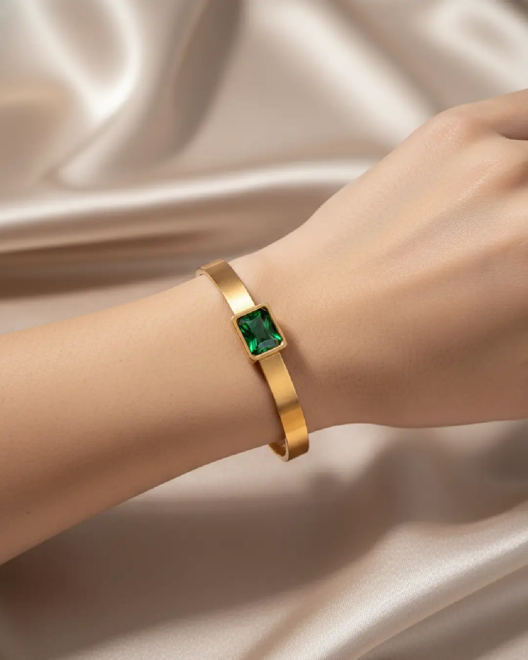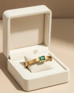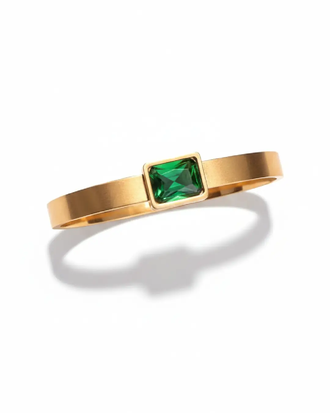 Unlike traditional high-shine jewelry, the soft matte finish of the gold allows the deep forest-green facets of the gemstone to take center stage. Its slim profile makes it perfect for layering, while the sharp, rectangular silhouette ensures it stands out as a singular statement of modern luxury.