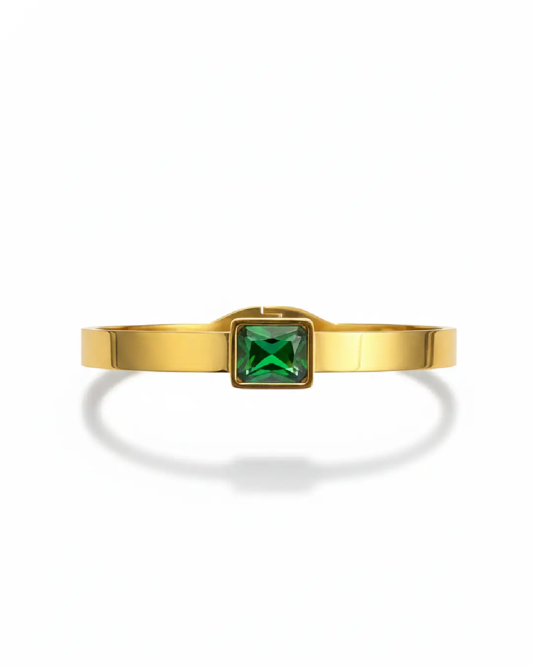 This minimalist bangle features a signature emerald-cut stone, bezel-set into a sleek, 18k gold-plated band.