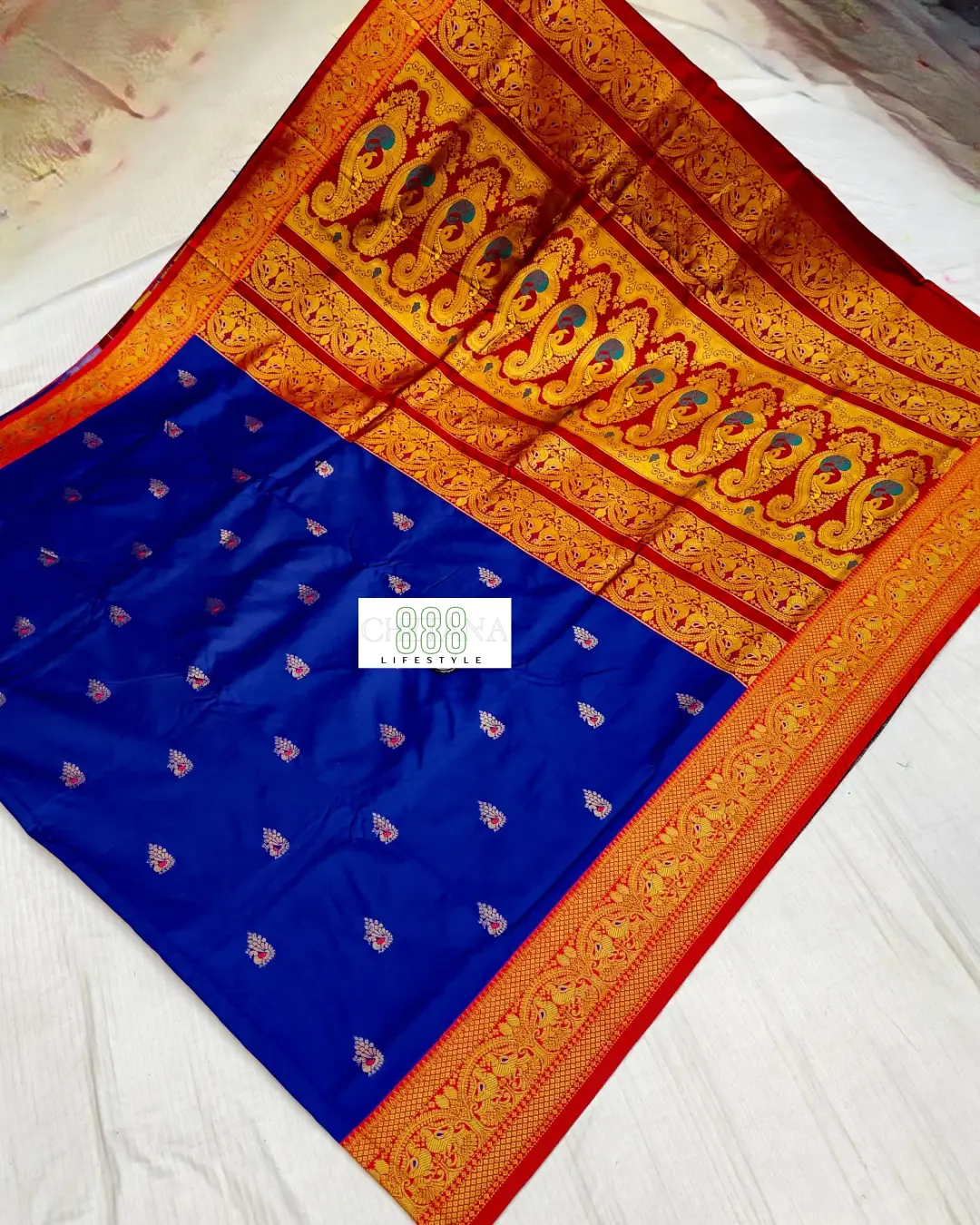 The Pallu: The showstopper is the heavy Paithani pallu, showcasing the iconic Peacock (Munda) and floral motifs in multi-colored silk threads and gold zari. It’s a masterpiece of weaving that exudes royalty.