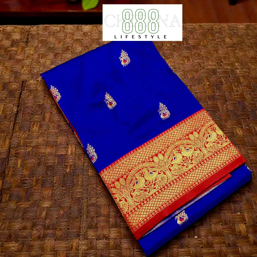 The Body: The saree features a rich, lustrous sapphire blue base crafted from high-quality half-silk fabric. It is adorned with delicate gold zari buttas (motifs) that add a subtle shimmer to every movement.