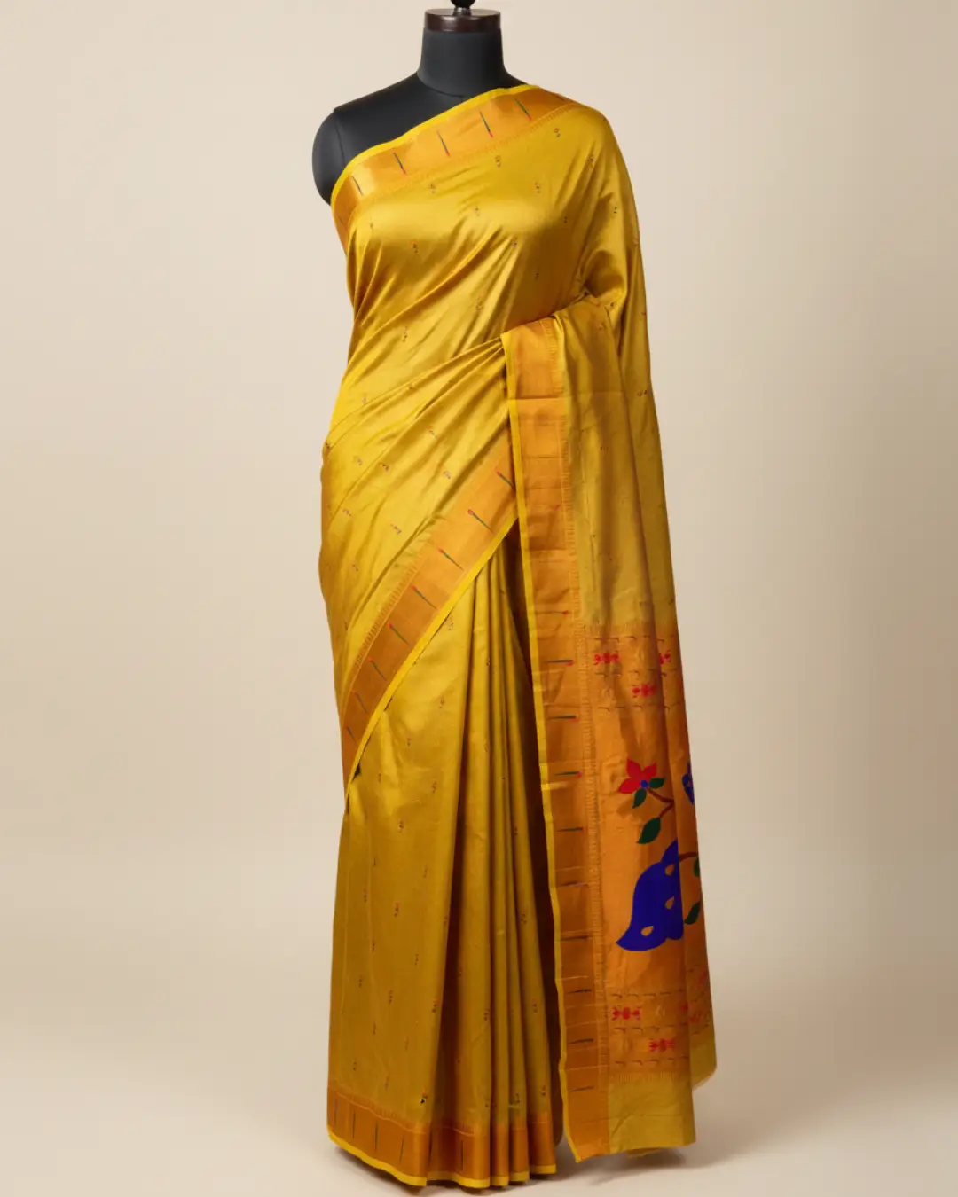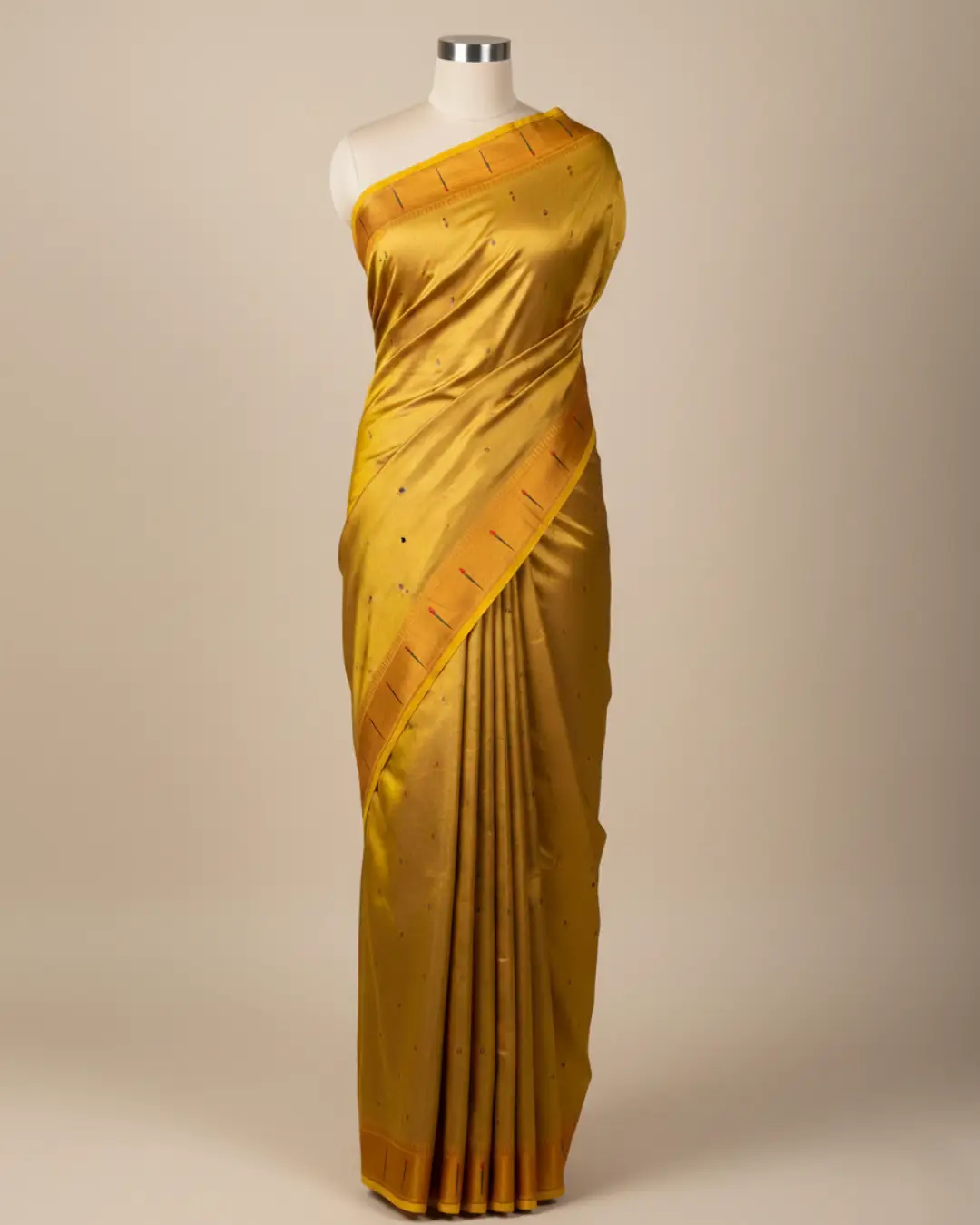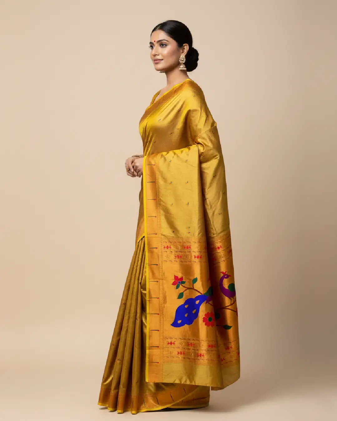 Embrace the grandeur of Maharashtrian heritage with our Tejasvi Muniya Silk Paithani. Draped in a mesmerizing shade of mustard gold, this saree features a dual-tone “dhup-chaon” (sunshine and shadow) effect that catches the light beautifully with every movement.