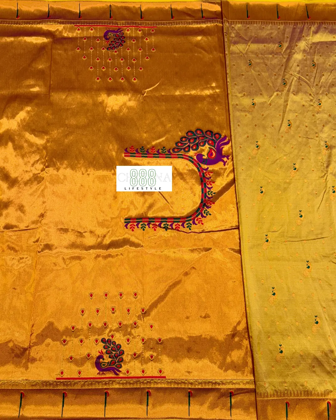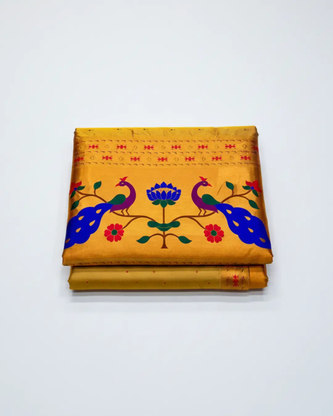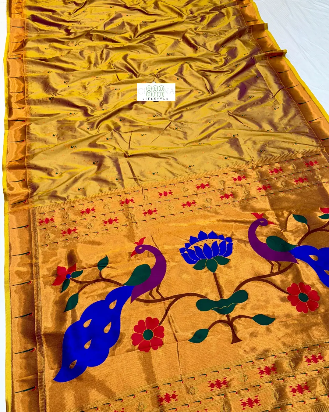 Embrace the grandeur of Maharashtrian heritage with our Tejasvi Muniya Silk Paithani. Draped in a mesmerizing shade of mustard gold, this saree features a dual-tone “dhup-chaon” (sunshine and shadow) effect that catches the light beautifully with every movement.