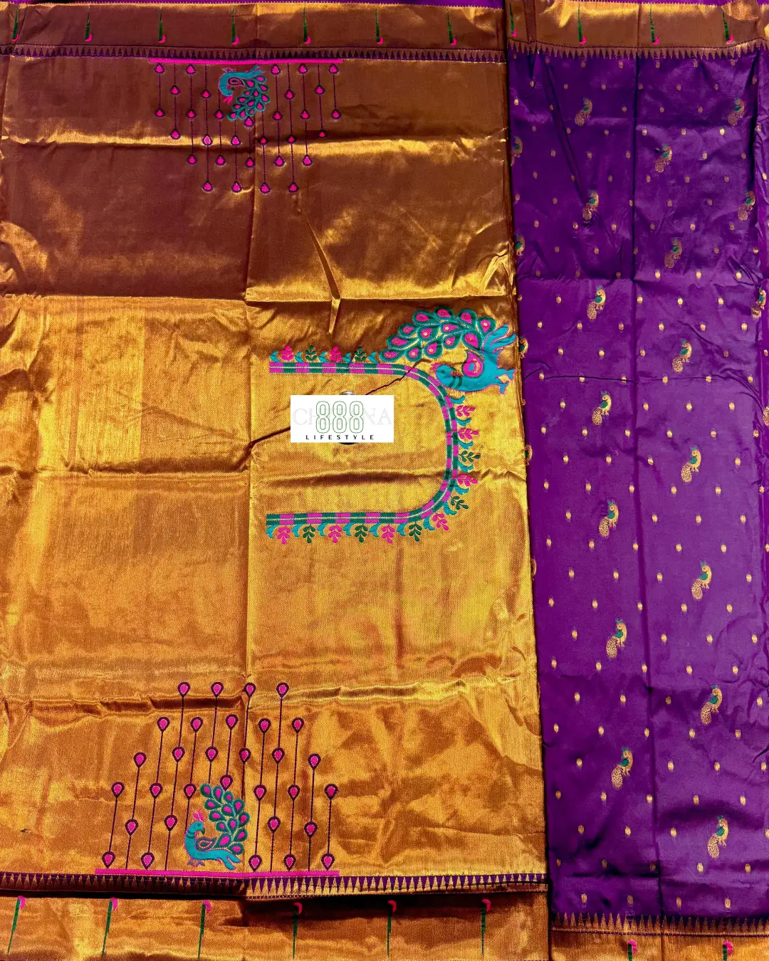 Design Heavy traditional gold tissue pallu with iconic peacock and lotus motifs. Classic Muniya border design in shimmering gold Zari.