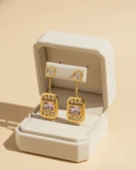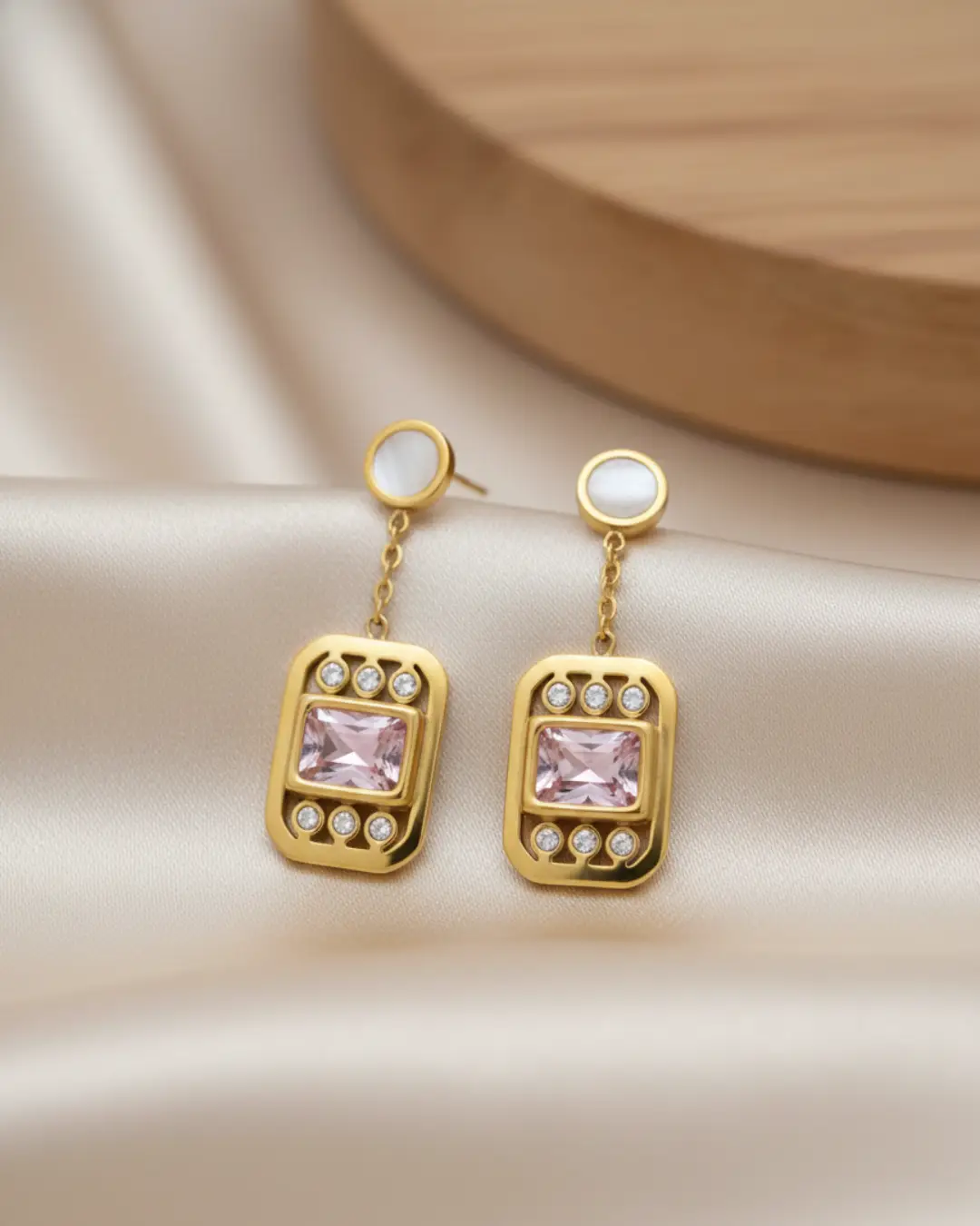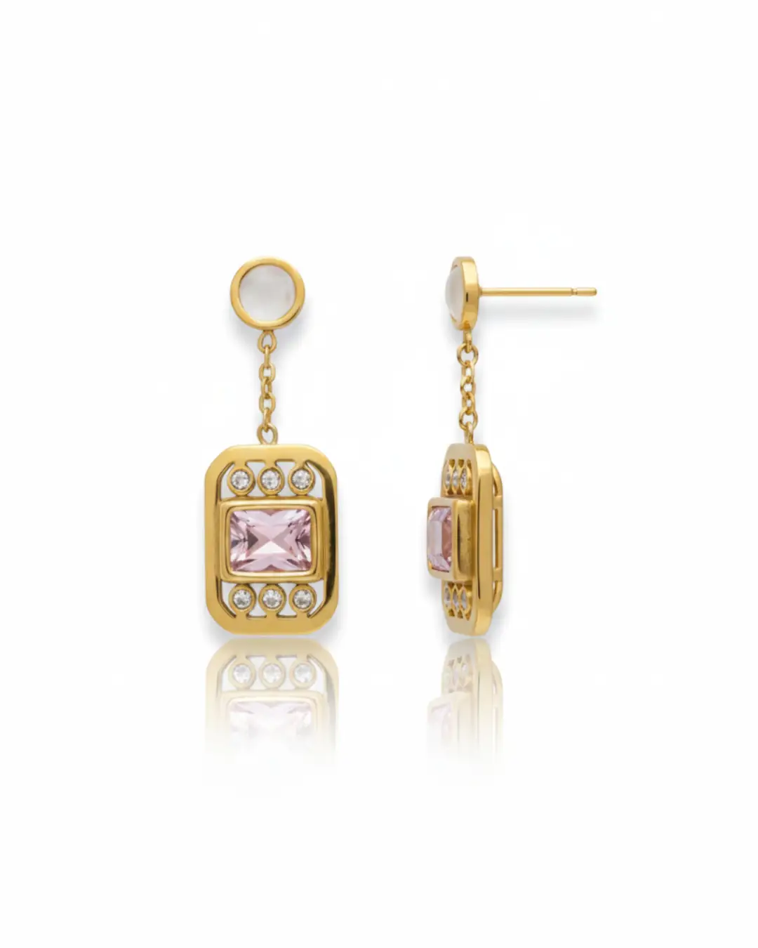 Capture the elegance of a bygone era with a contemporary twist. These exquisite drop earrings feature a central emerald-cut blush pink crystal, encased in a detailed gold-plated rectangular frame. The design is elevated by delicate open-work filigree and shimmering white pavé accents that catch the light with every movement.