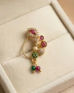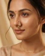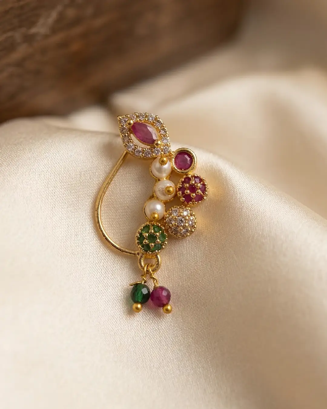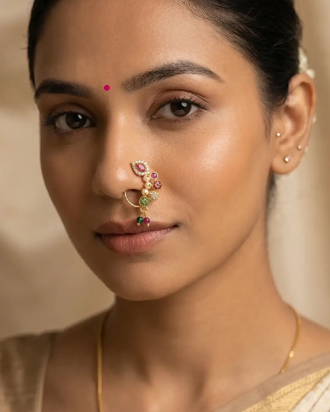 his Peshwa-inspired Nath features a sophisticated blend of hand-set rubies, emeralds, and pearls. The unique vertical arrangement and shimmering stone-encrusted leaf at the top offer a graceful silhouette that frames the face beautifully.
