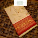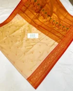 The Pallu: A grand display of traditional artistry, featuring rich zari work and iconic Peacock motifs that symbolize royalty and beauty.