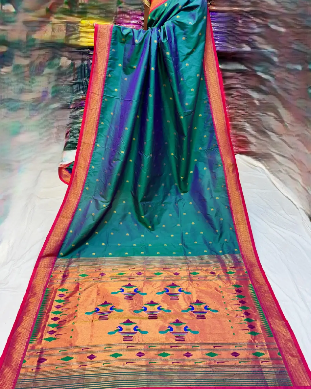 Dual-Tone Teal Silk with Traditional Copper Zari Kanjivaram Border Paithani Saree
