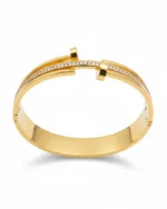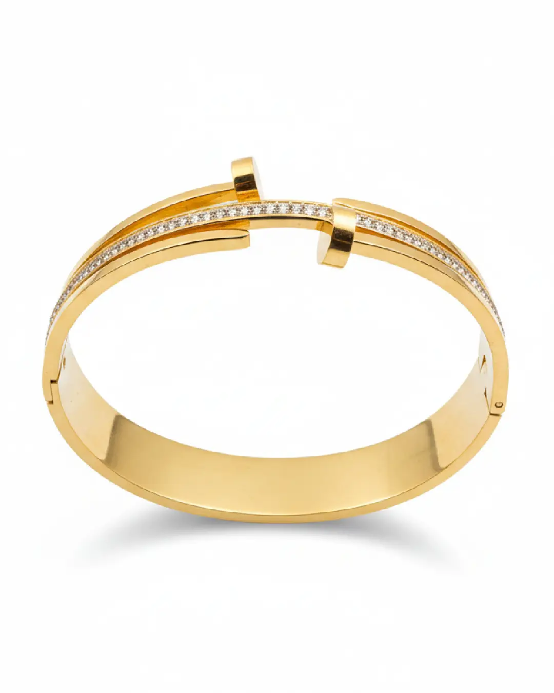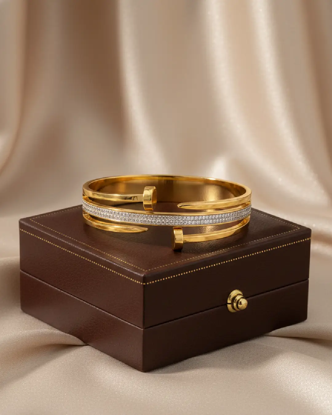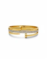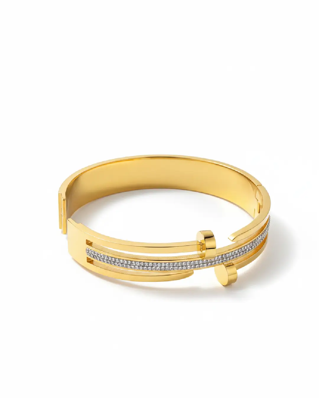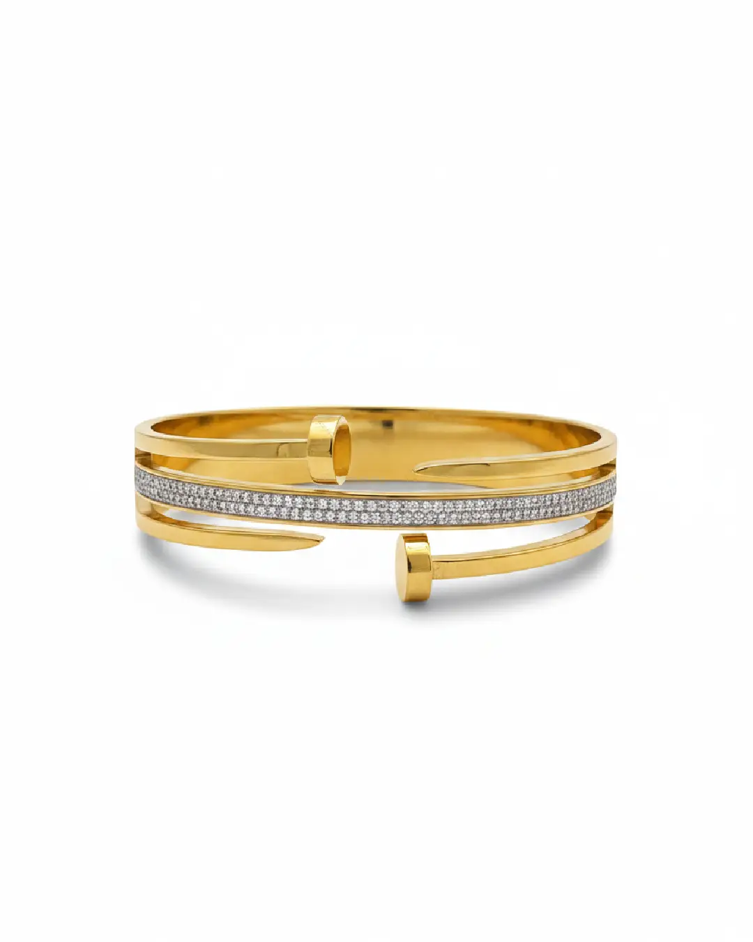 Featuring a unique three-band design, the outer gold tiers terminate in sharp, polished points, while the central band is encrusted with a meticulous pavé of brilliant-cut stones. Forged in high-polish 18K gold plating over a durable core, ensuring a weighty, substantial feel on the wrist. The juxtaposition of the raw, nail-head ends against the refined shimmer of the center band creates a look that transitions effortlessly from daytime power-dressing to evening glamour.